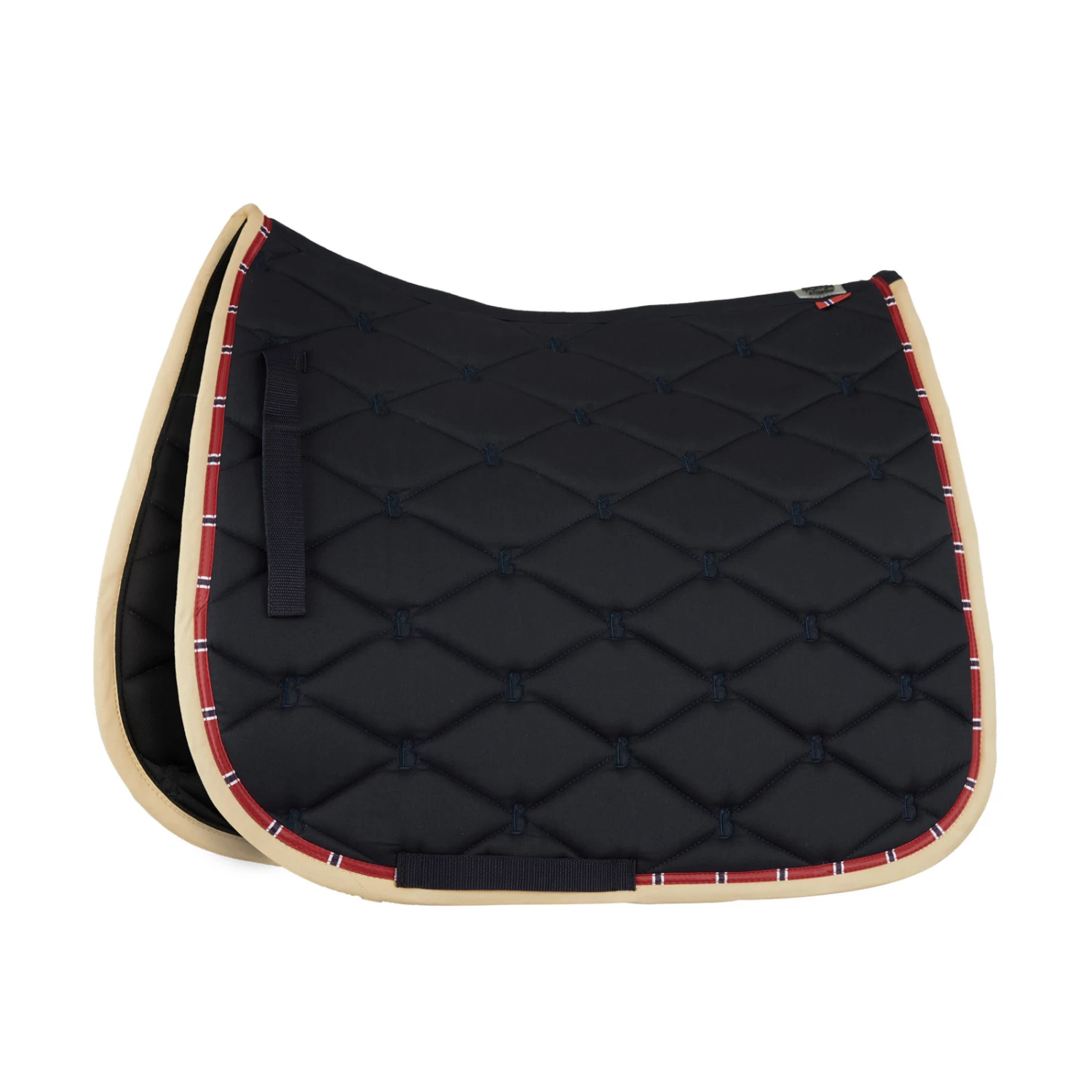 The B Vertigo Amory saddle pad is breathable and quick drying to provide comfort for your horse. Dust repellent properties keep it fresh. Classic colors and logo embroidery make for a luxurious look. Also available as all purpose version. Combine it with our B Vertigo Amory bandages and ear net for a full look!