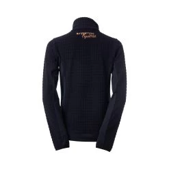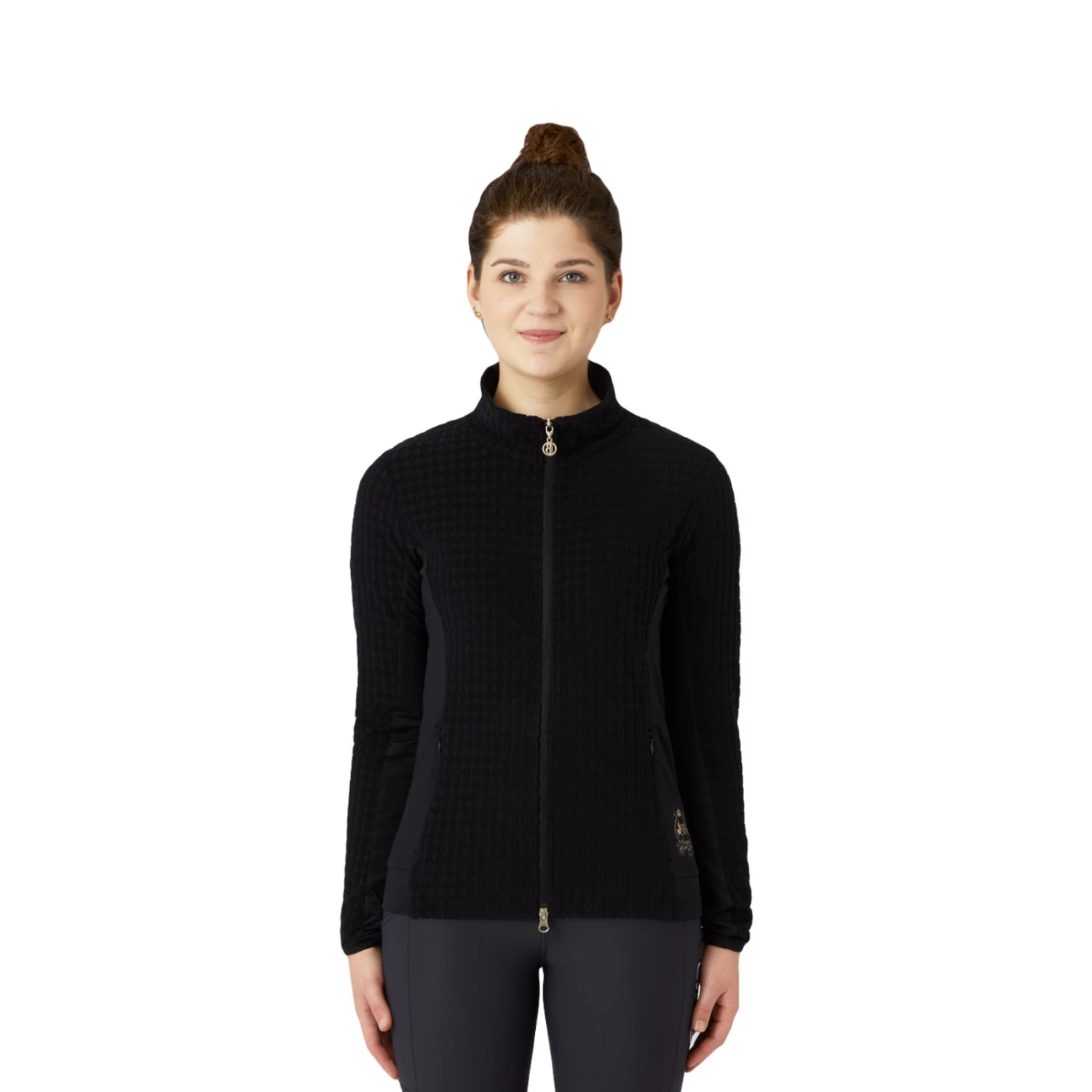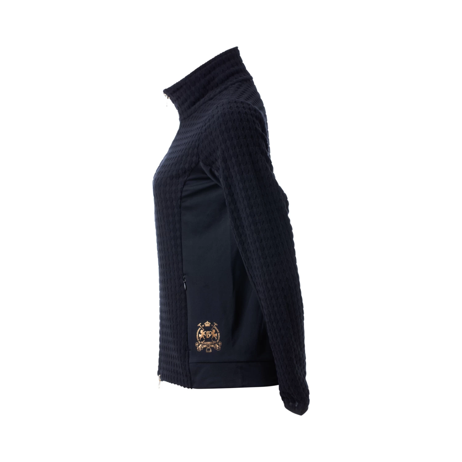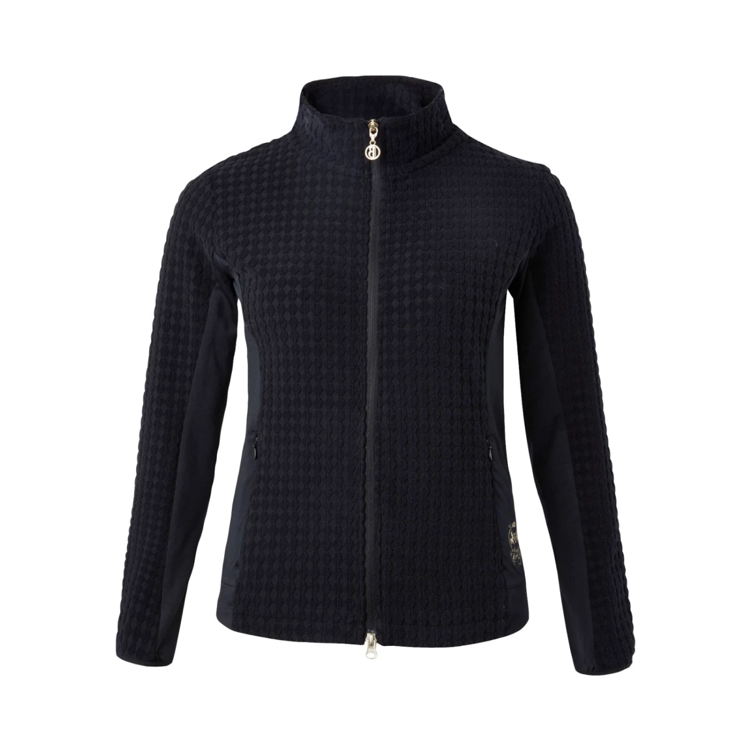 Soft fleece jacket with generous mesh inserts at the sides and under the sleeves for increased breathability. Hidden zipper pockets at the front. Delicate pale gold details like front two-way zipper and logo print at lower hem and below back neck. The bubbly fleece fabric creates a stir not only at the stables.