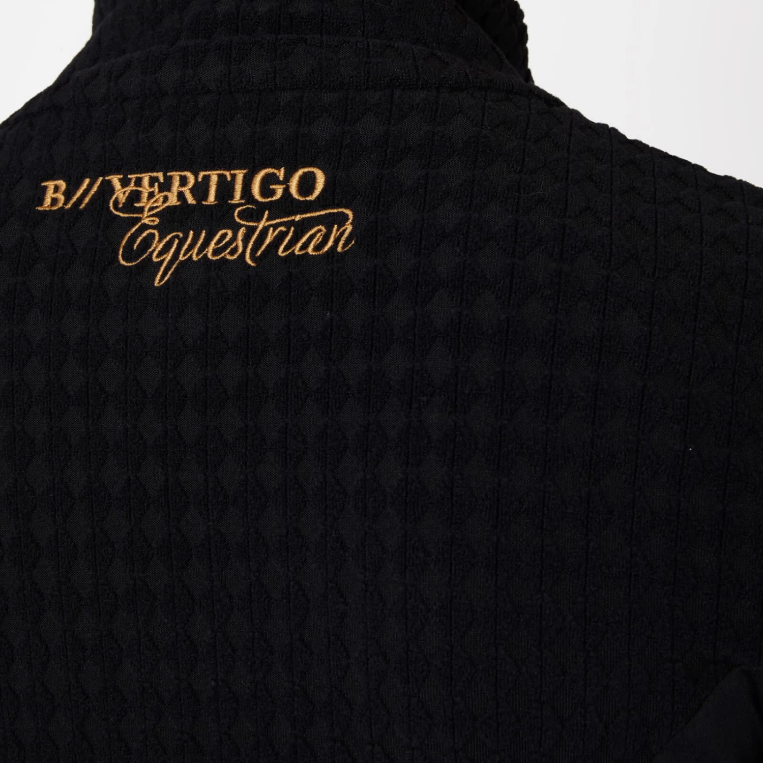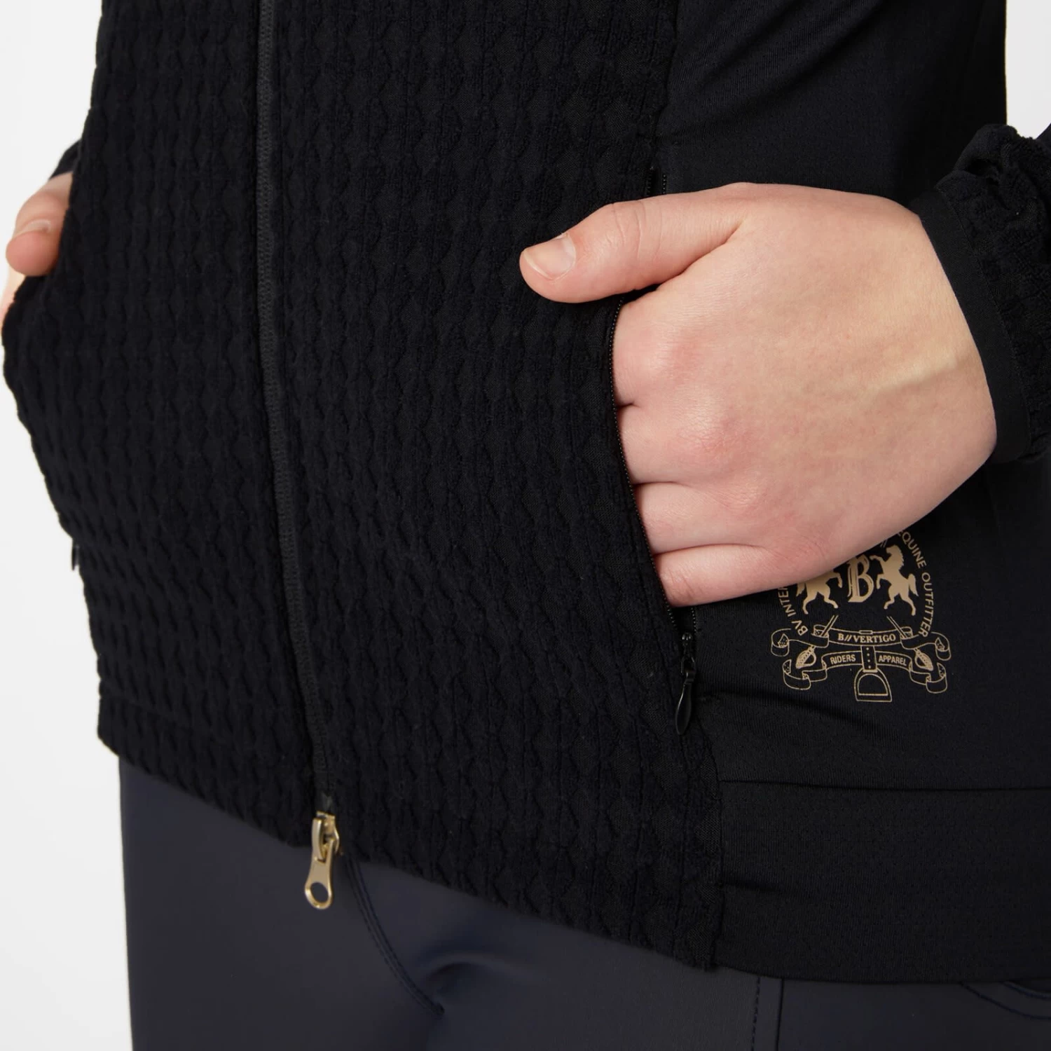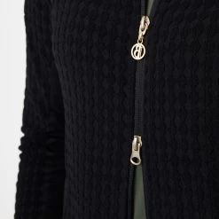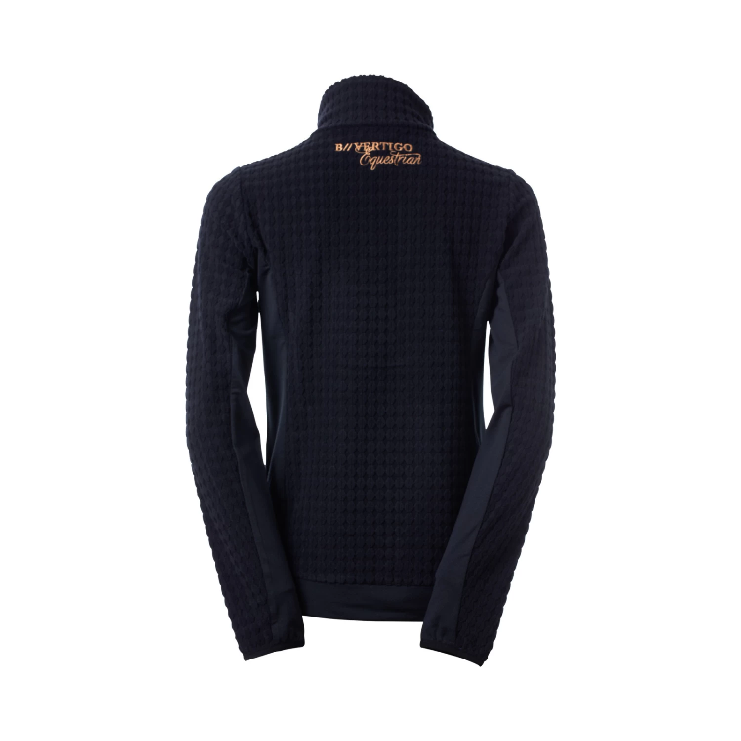 Soft fleece jacket with generous mesh inserts at the sides and under the sleeves for increased breathability. Hidden zipper pockets at the front. Delicate pale gold details like front two-way zipper and logo print at lower hem and below back neck. The bubbly fleece fabric creates a stir not only at the stables.