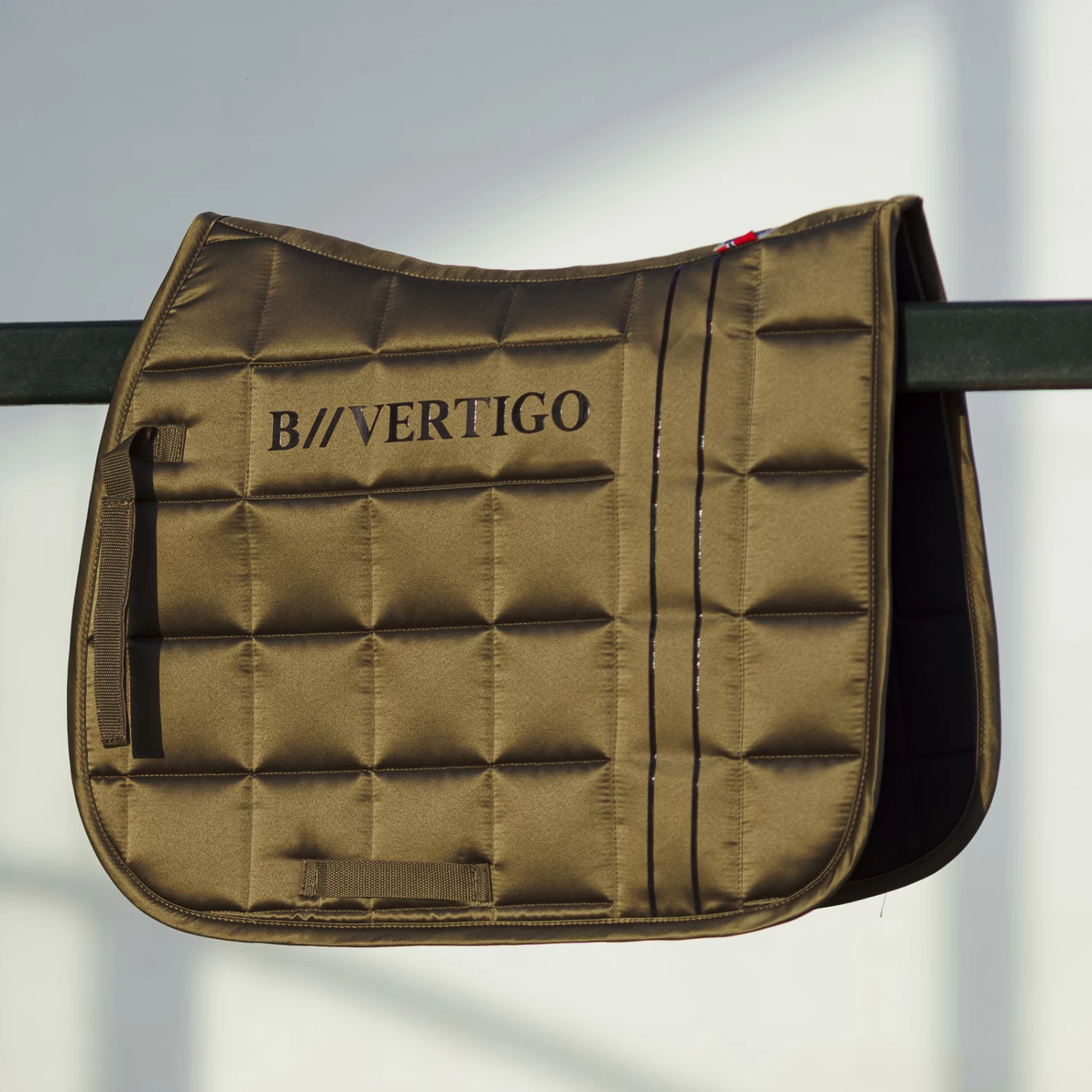 Our B Vertigo Drew saddle pad is made with quick-dry lining that is breathable and moisture wicking. Square quilting provides comfort beneath the saddle, and silicone stripes and logo add grip to keep the saddle in place. Muted colors are timeless, and easily match your tack. This saddle pad is also available in dressage cut. Combine it with our B Vertigo ear net and brushing boots for a full look!