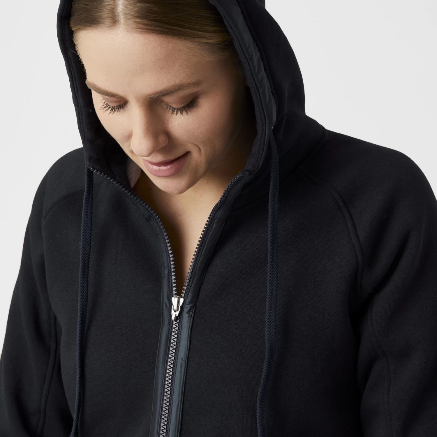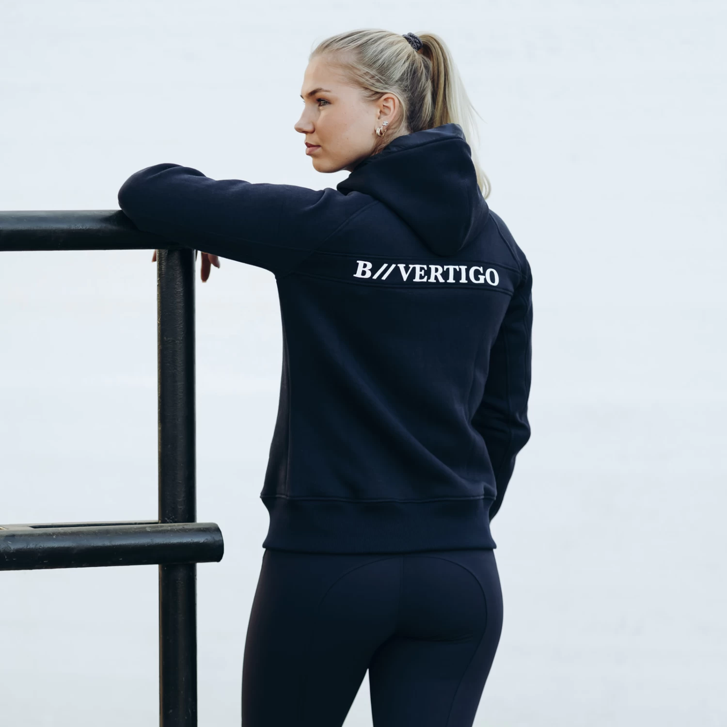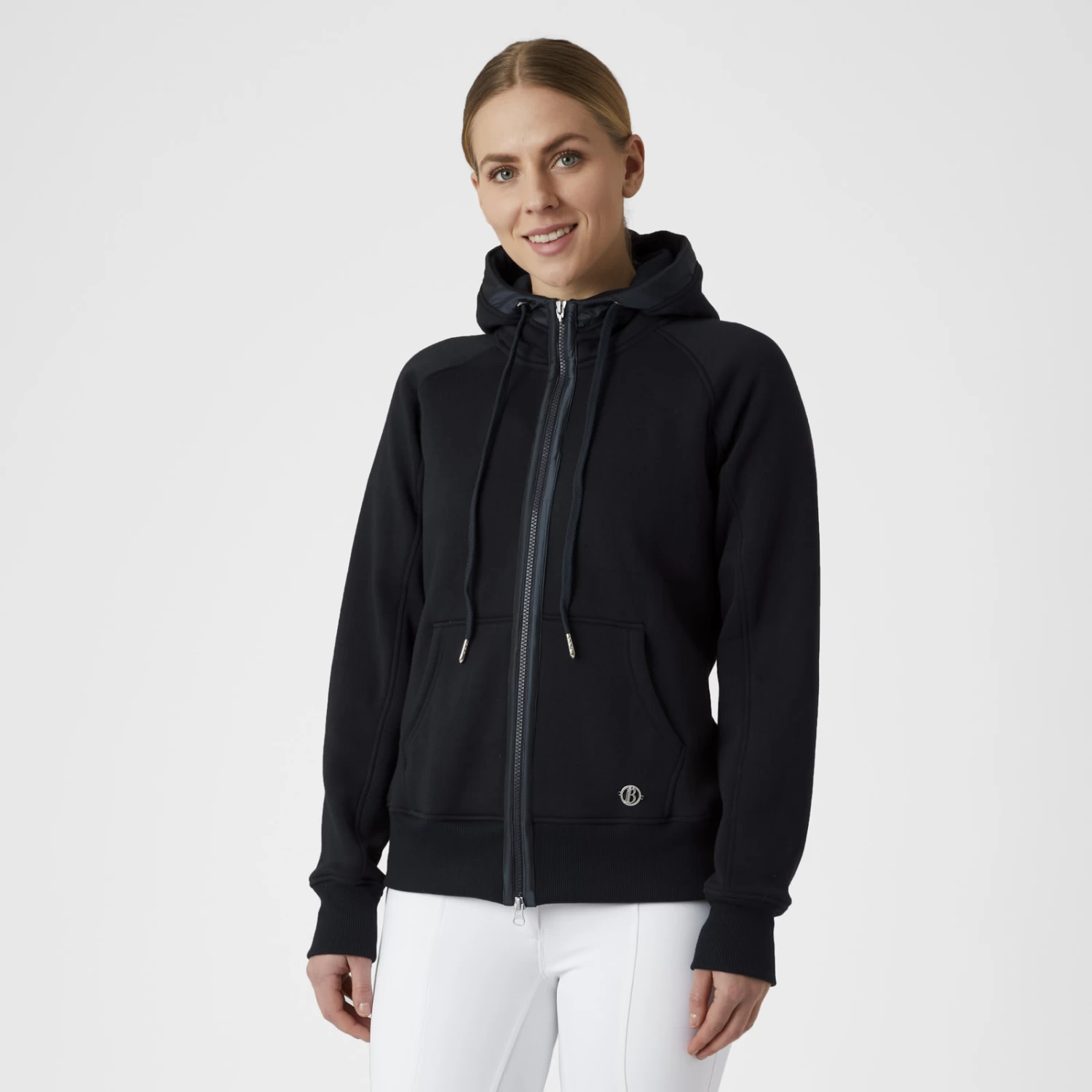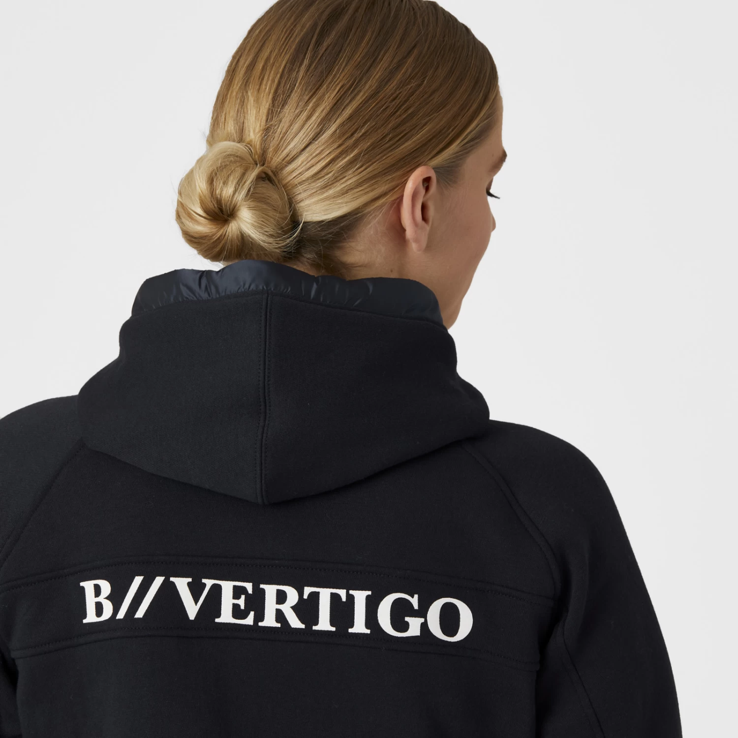 Our B Vertigo Gianna sweat jacket is super comfortable for riding. Soft, elastic material with brushed inside keeps you warm when you need it, and is easy to throw on over your favorite shirt. The adjustable hood and ribbed cuffs add extra warmth and keep the wind away. Shiny fabric around hood and zipper is an eye-catching detail. The big back print looks cool and adds sporty vibes. Pair this hoodie with your favorite breeches, riding tights or jeans.