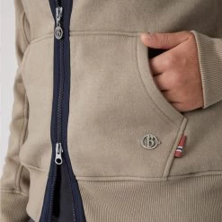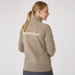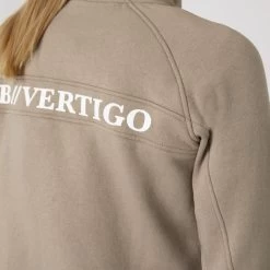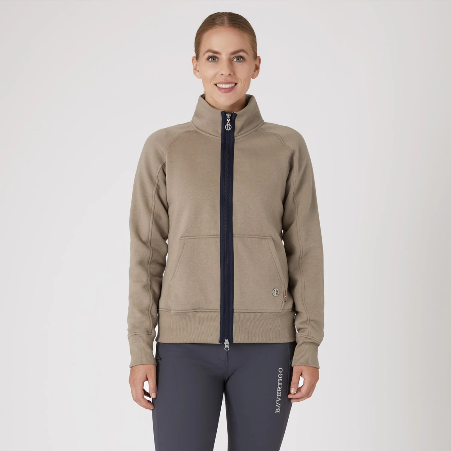 The B Vertigo Gianne sweatshirt jacket is soft and comfortable. Elastic material does not restrict your movement, and ribbed cuffs and hem add extra warmth. Kangaroo pockets are practical. The big logo back print adds a sporty vibe. The classic fit and neutral colors complete every outfit. Wear this light jacket over your favorite shirt and tie it around your waist when it gets warmer. A high end staple for season after season!