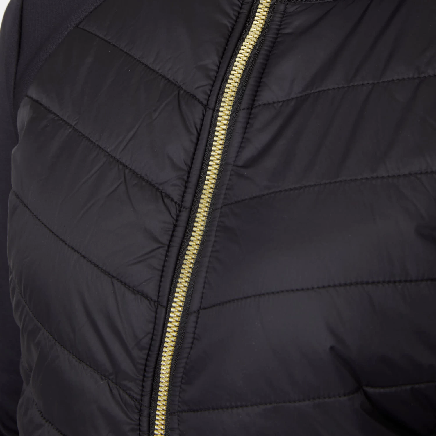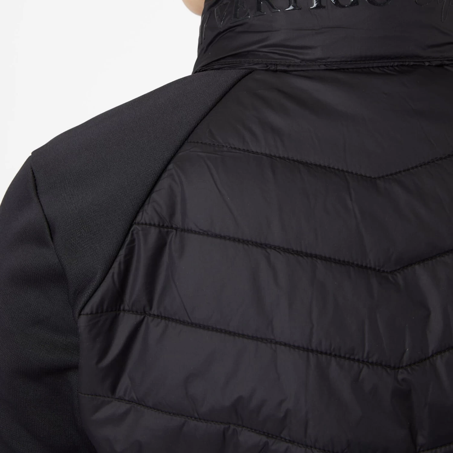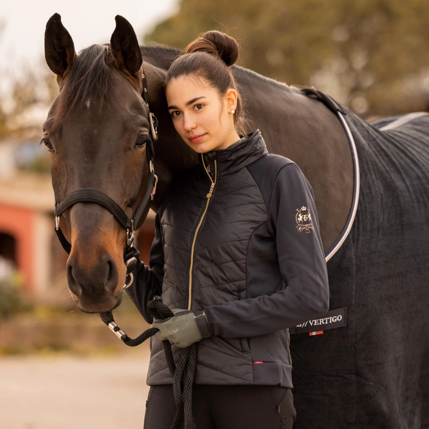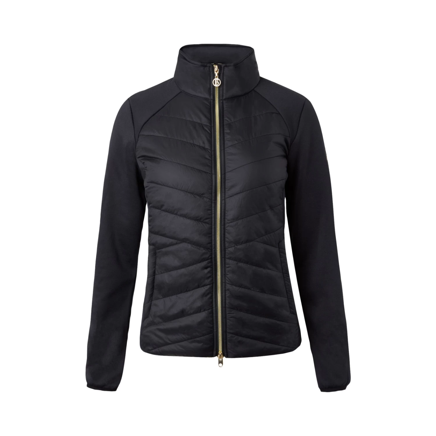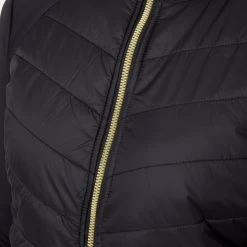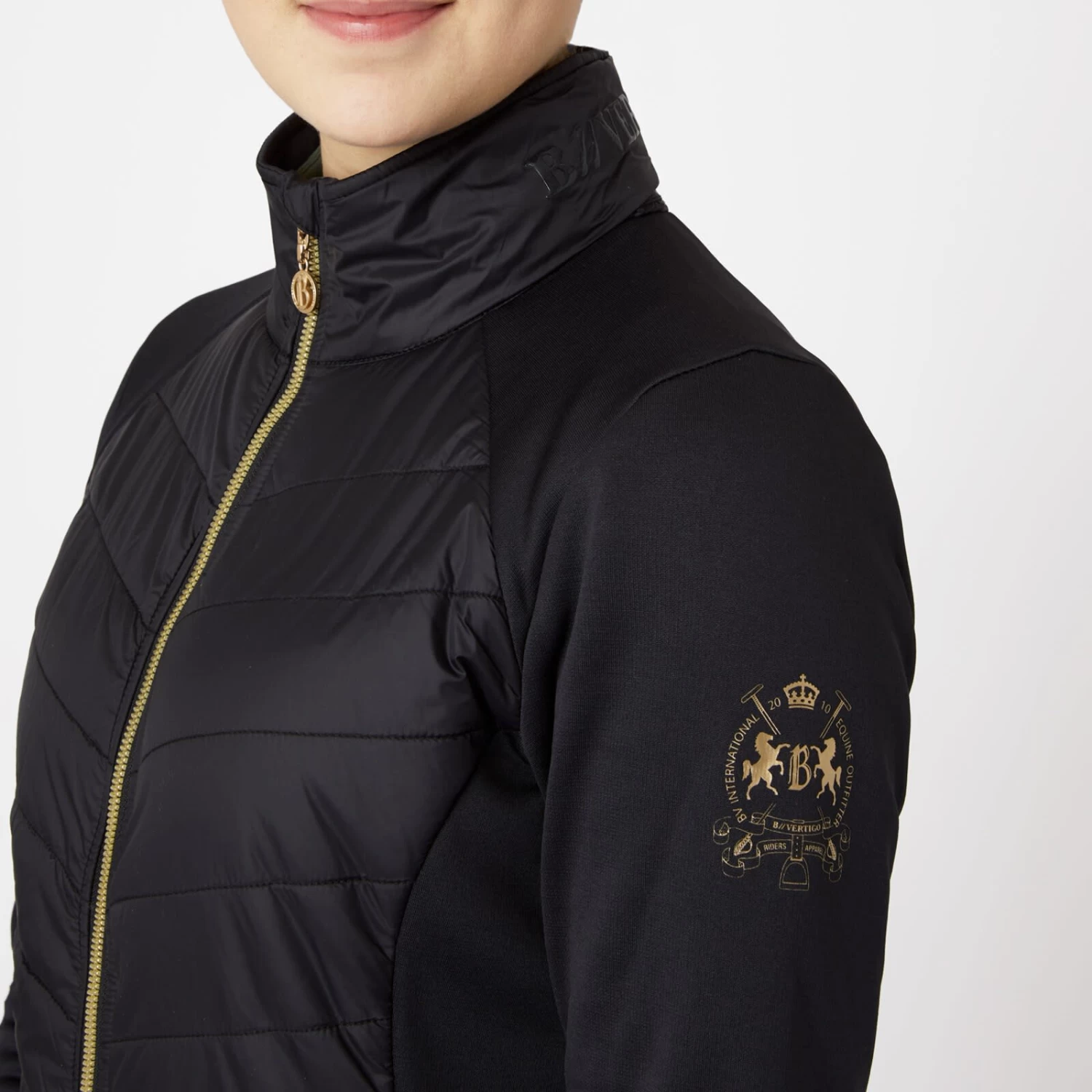 Classy riding jacket with slimming quiliting at the body. A golden two-way zip makes it the perfect style for riding. Delicate B Vertigo logo on left sleeve also in gold color and B Vertigo Equestrian lettering across the stand-up collar. Stretch panels at the sides for increased freedom of movement. Hidden hood inside the collar to make it though a passing shower dryly.