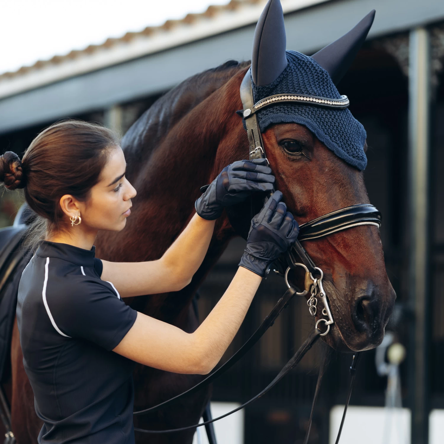 Our B Vertigo Laurel ear net is made from delicate crochet. Elastic ears and trim are designed in soft colors that can easily be incorporated into your tack. Combine this ear net wieh our B Vertigo Laurel saddle pad and fleece bandages.