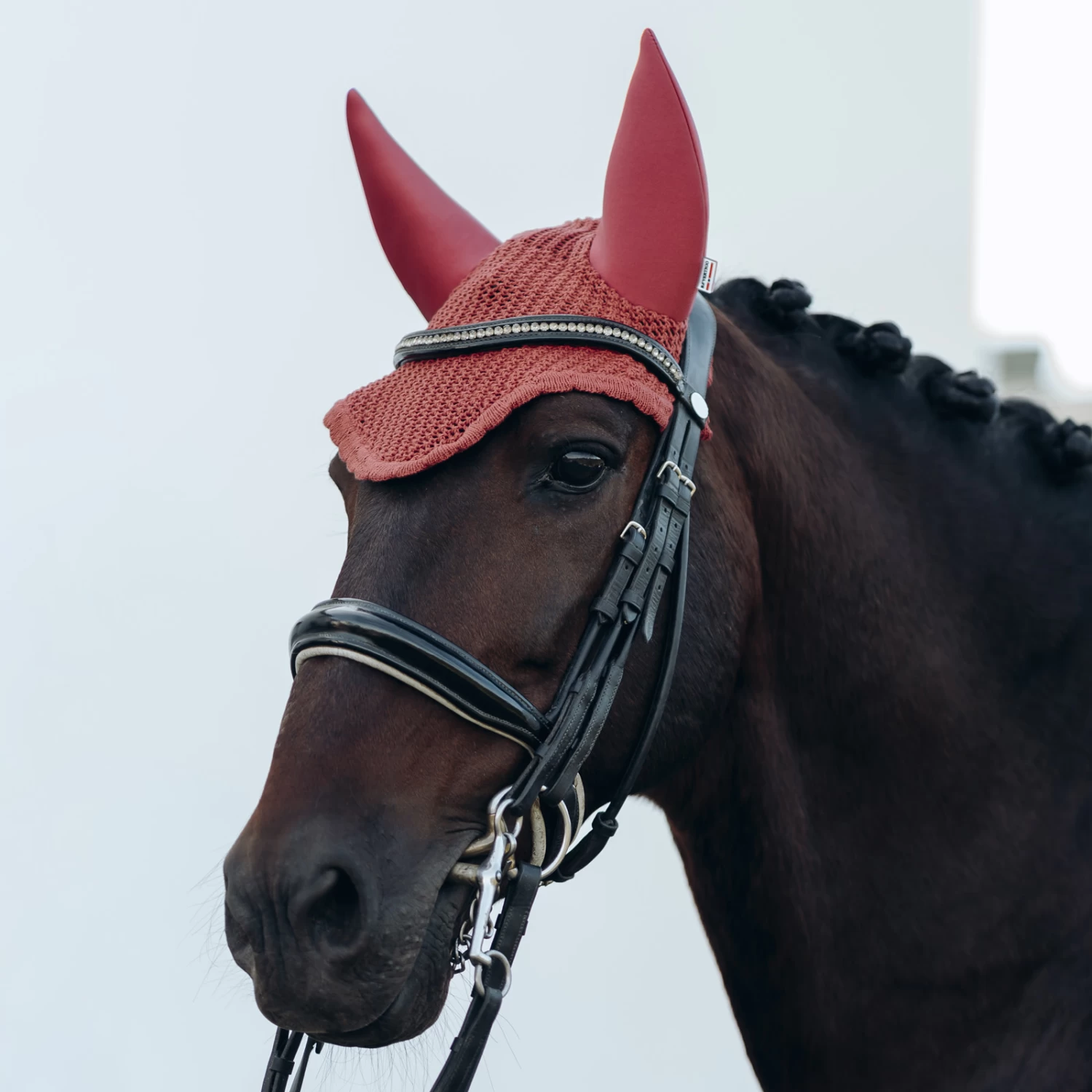 Our B Vertigo Laurel ear net is made from delicate crochet. Elastic ears and trim are designed in soft colors that can easily be incorporated into your tack. Combine this ear net wieh our B Vertigo Laurel saddle pad and fleece bandages.
