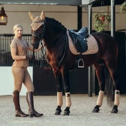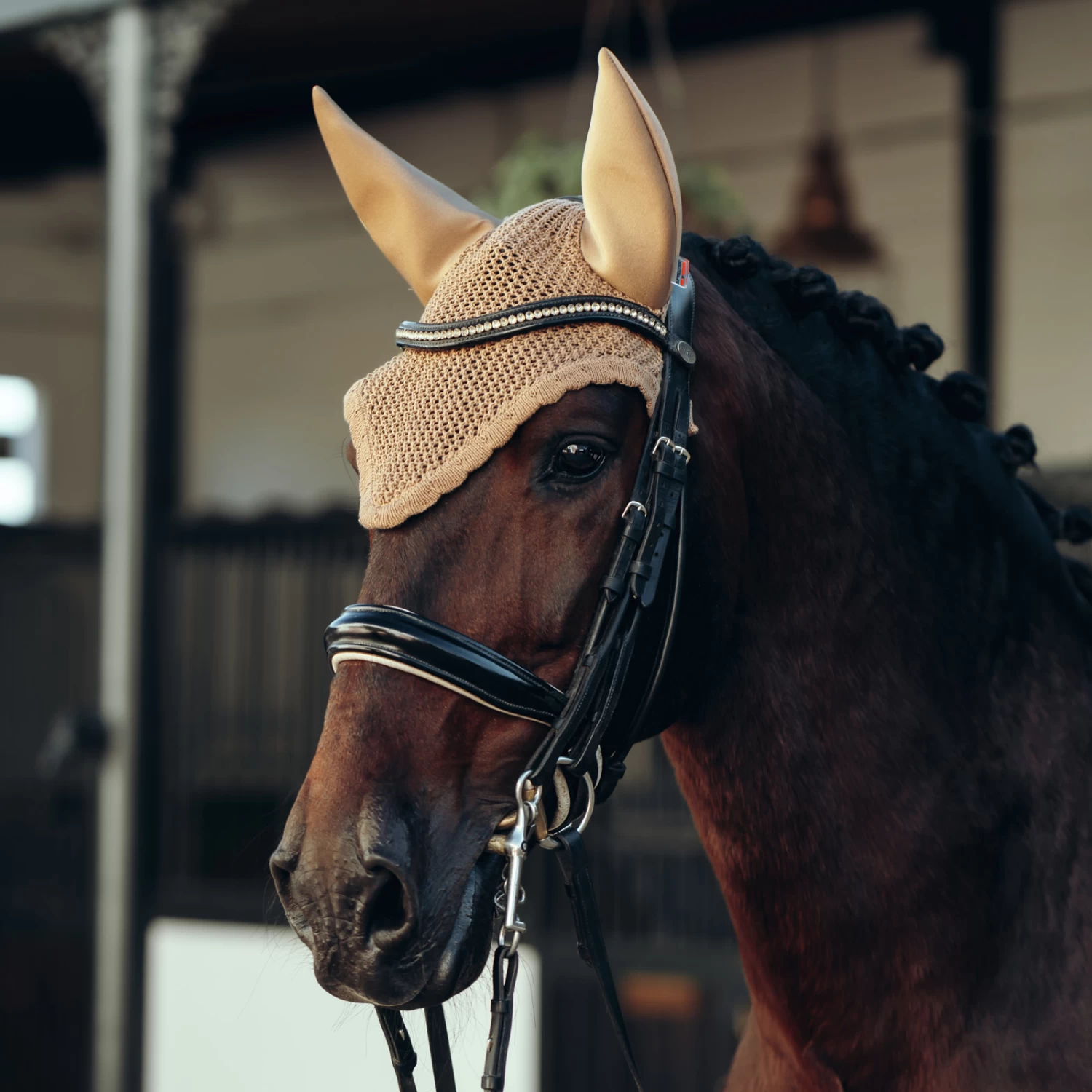 Our B Vertigo Laurel ear net is made from delicate crochet. Elastic ears and trim are designed in soft colors that can easily be incorporated into your tack. Combine this ear net wieh our B Vertigo Laurel saddle pad and fleece bandages.