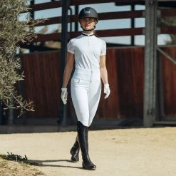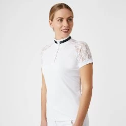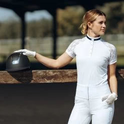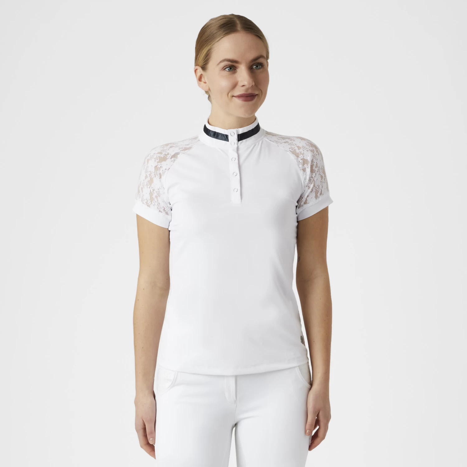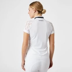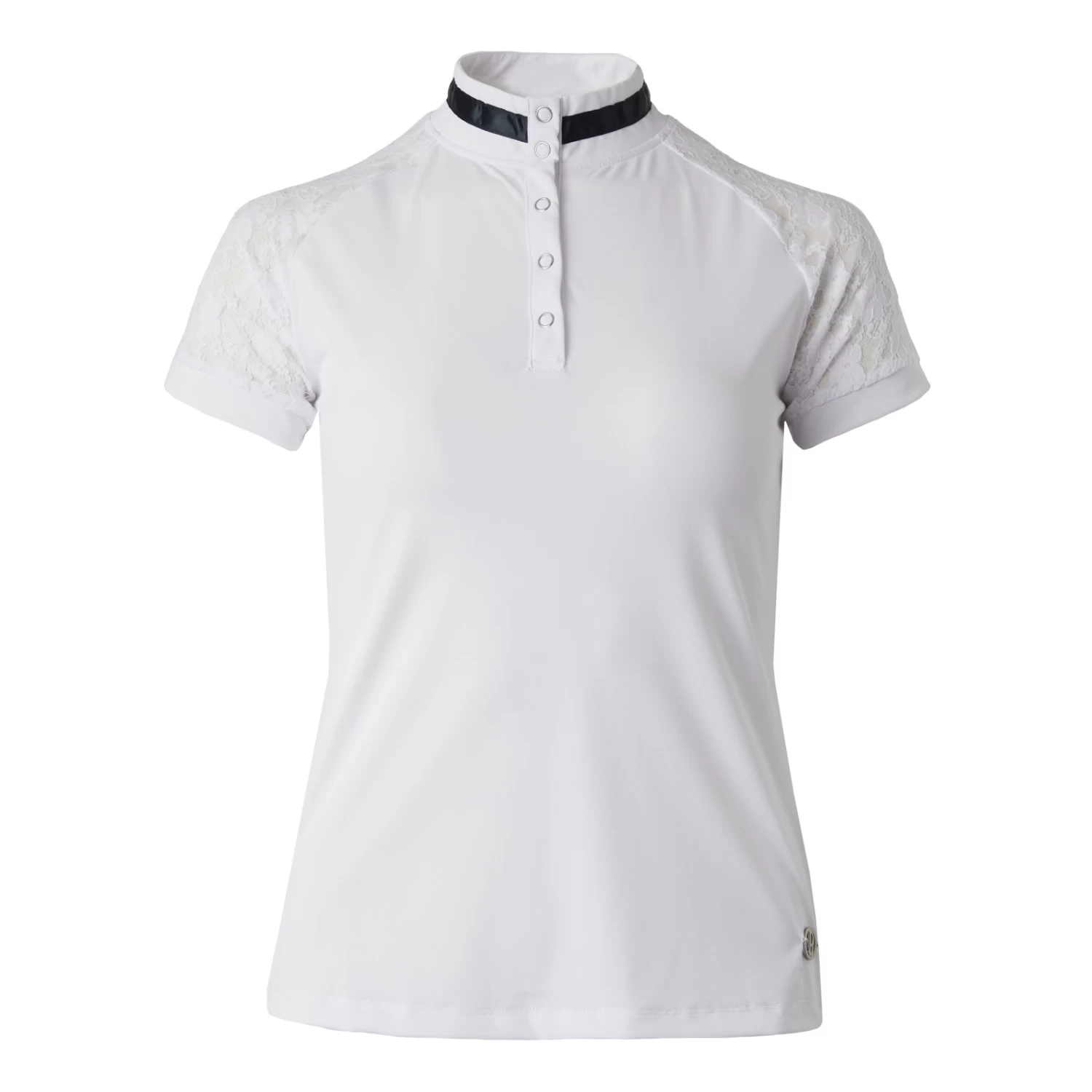 Our B Vertigo Lauren show shirt is made from soft, breathable piqué fabric that feels cooling on the skin. The collar is decorated with a satin band, and closes with press buttons. Gorgeous lace sleeves add an elegant feature to this pretty show shirt. Pair it with your favorite white breeches, and nothing will stop you.