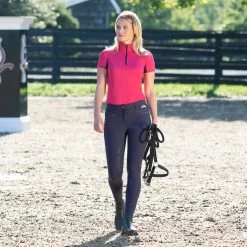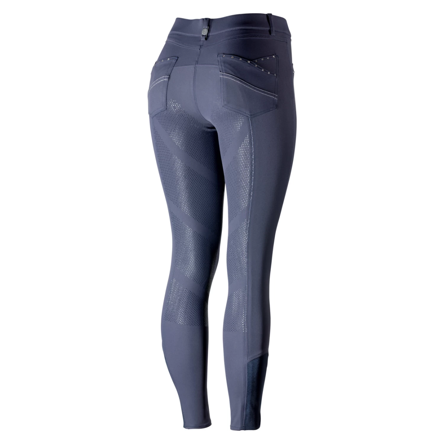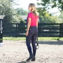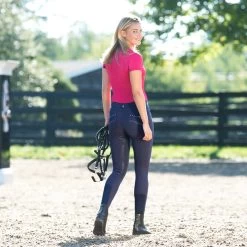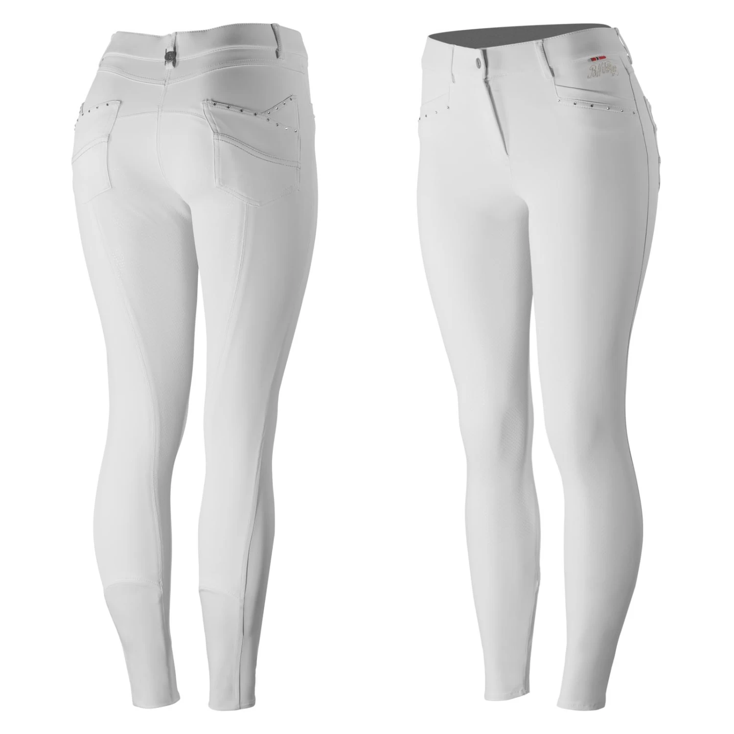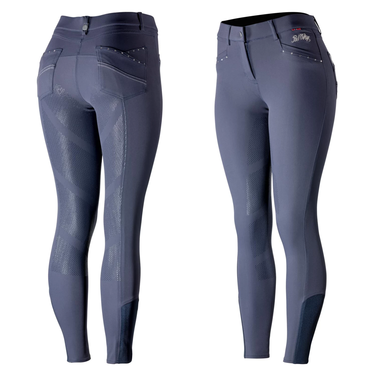 These breeches feature easy stretch fabric that wears like a glove with the quality details you expect. The Swarovski crystal details add a nice finishing touch to these comfortable breeches. Set yourself apart in the warm-up ring with these elegant breeches with a comfortable, medium waist. The high-quality silicone print full seat helps to keep you secure in the saddle, while the fit at the calf has been improved. The Olivia Full Seat Breeches, by B Vertigo, will stand up to all day wear and dust and debris will whisk away so you look fresh from morning until night. These superb riding pants are made from 4-way stretch, breathable and moisture wicking fabric that is UV protected (UPF 50+). BV Opti-Pro fabric.