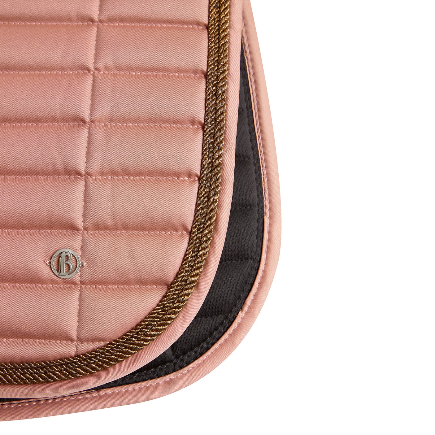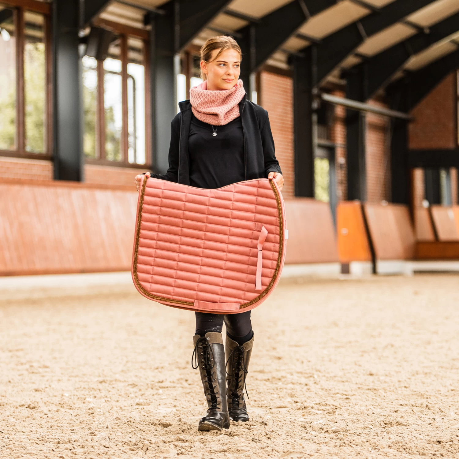 The B Vertigo Quinn saddle pad is made from high density material that perfectly cushions your movements. Quick-drying material wicks away any moisture. Rectangular quilting and three rows of cord around the edges make for a stunning look. The anatomically shaped spine brings a sporty touch. Pair this saddle pad with our B Vertigo Quinn ear net for a full look! Also available as dressage version.