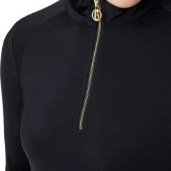 Perfect training shirt for layering or spring days with a moisture wicking fabric that feels cool against the skin and has a UV protection. The mesh below the armpit for increased breathability. A delicate gold B Vertigo lettering below the back neck and logo on the left sleeve top of the classy design. Matching pale gold zip.