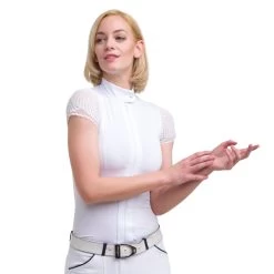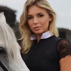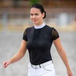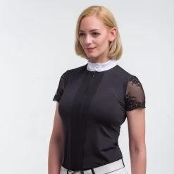 This show shirt is designed in a lace-sleeve style and front zip. Made of technical CoolP and silk soft lace fabrics for functionality and softness against the skin.
