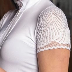 This show shirt is designed in a lace-sleeve style and front zip. Made of technical CoolP and silk soft lace fabrics for functionality and softness against the skin.