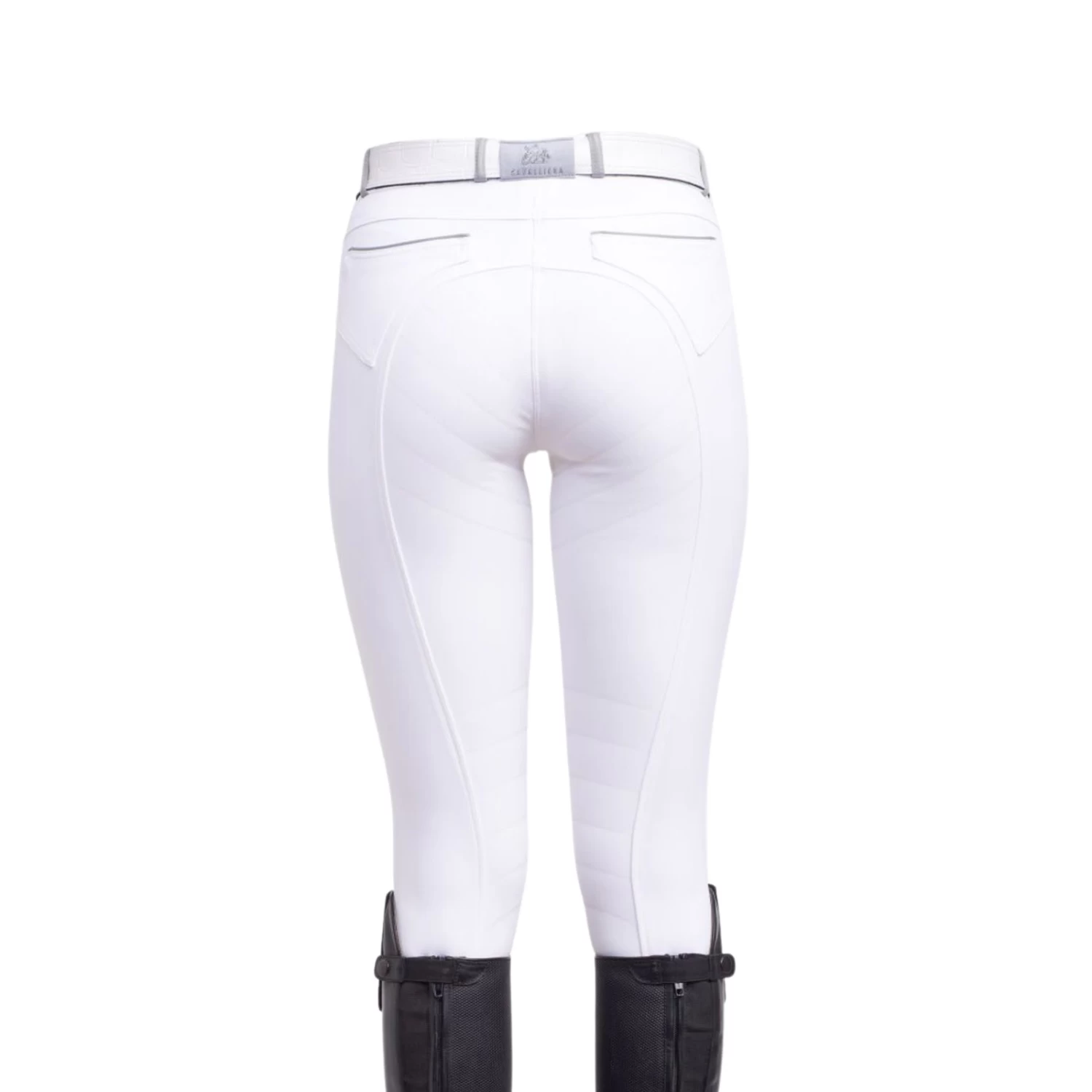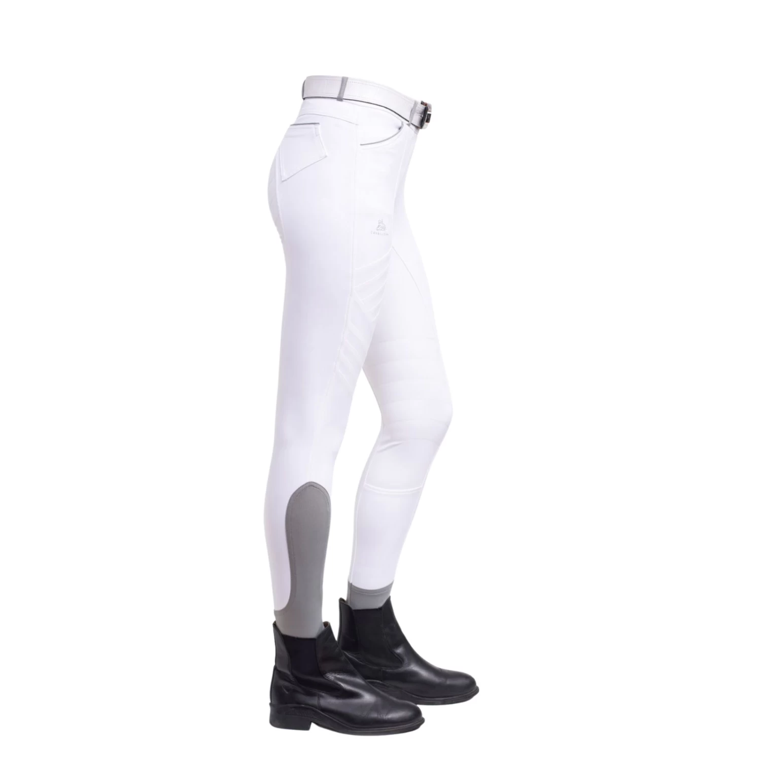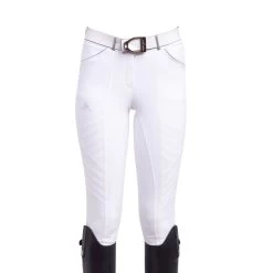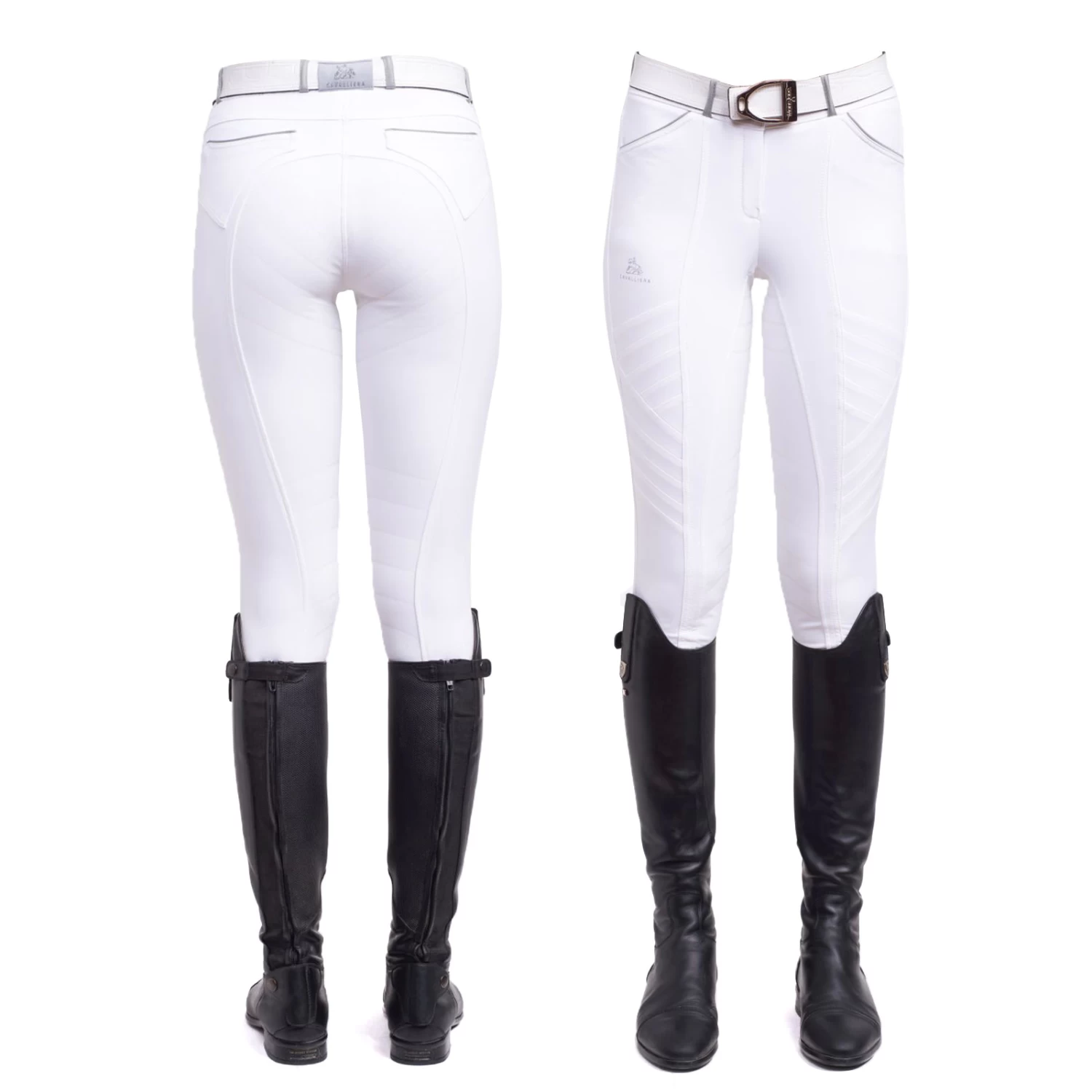 High performance riding breeches that were created for a supportive, comfortable and uniquely flattering fit. Designed with competition needs in mind combining elegant styling, with performance lightware fabrics and Meryl Fiber Technology. Developed for active wearing, quick-drying, and exceptional comfort during the competition. These riding breeches fit all shapes and heights and enhance the mobility of knees due to the specialized side panelling. Featuring grip technology: the silicone print on the seat provides a secure grip in the saddle and more consistent leg position without the added bulk of a full-seat layer, and an additional silicone grip on the elasticated waistband gives fixed hold on the waist even under extreme movement during exercises. Contrast design makes these breeches an outstanding wear! Complete with contrasted single and wide belt loops, back and deep front pockets with contrasting piping, a stretch lycra sock on the bottom of each leg what allows boots to slip on with ease.