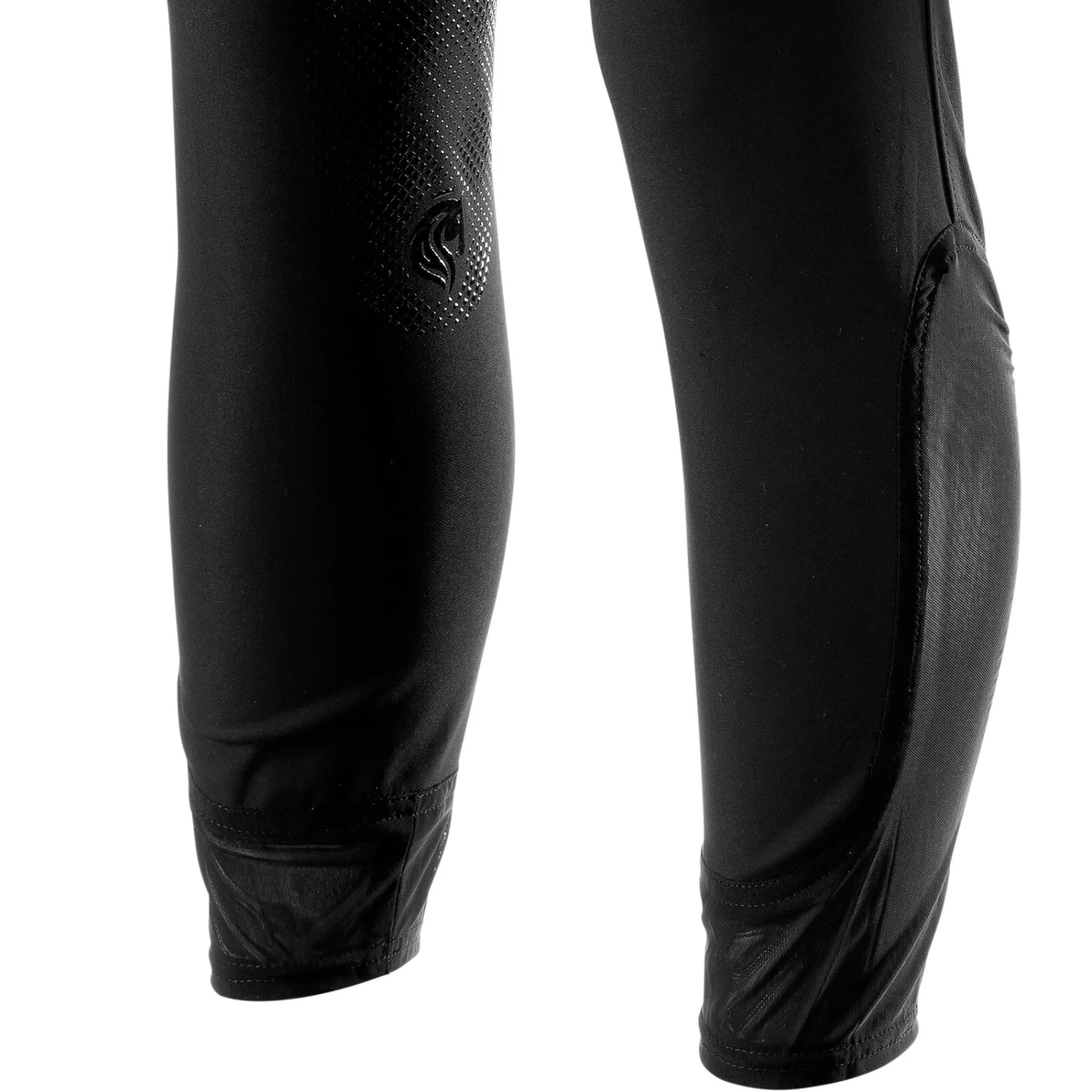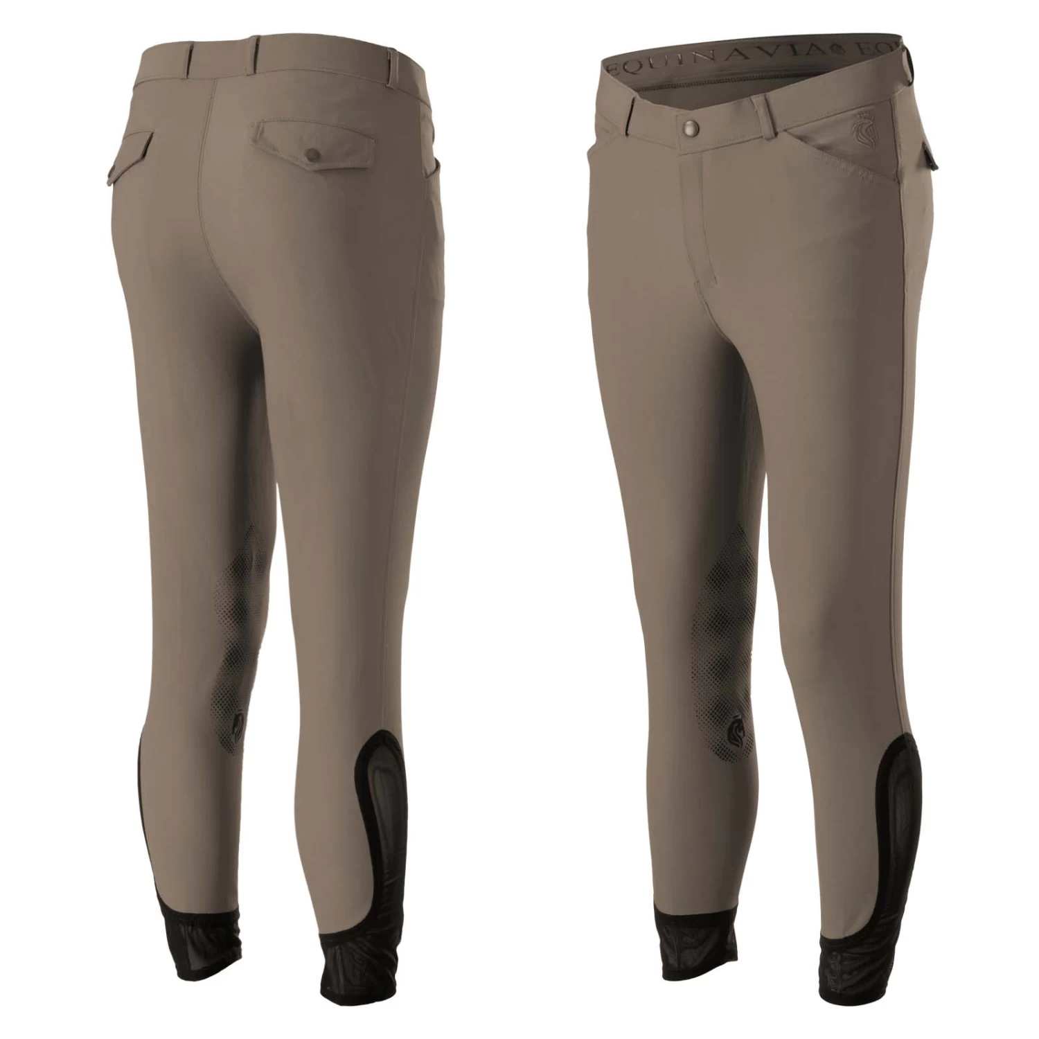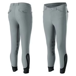 The fabric is high quality technical fabric with a lot of stretch from the spandex and offers moisture-wicking and quick-drying features. Spandex content provides just enough stretch to move with you comfortably and also helps with fabric shape retention and reduces waist gap and saggy knees. The fabric is lightweight, ideal for 3 season wear, and extra comfortable on warmer days. It has two front slash pockets with room for phone and treats along with two back flap pockets. The silicone grip on inner thighs is in a self subtle color for added hold when riding and the silicone grip inside the waist helps to keep shirt neatly tucked in. It features Gutos hook slide closure with internal reinforcement so only fabric touches and there is no hardware to pinch the skin. Durable and stretchy micromesh sock bottoms are added for minimal boot bulk. These are a must have!