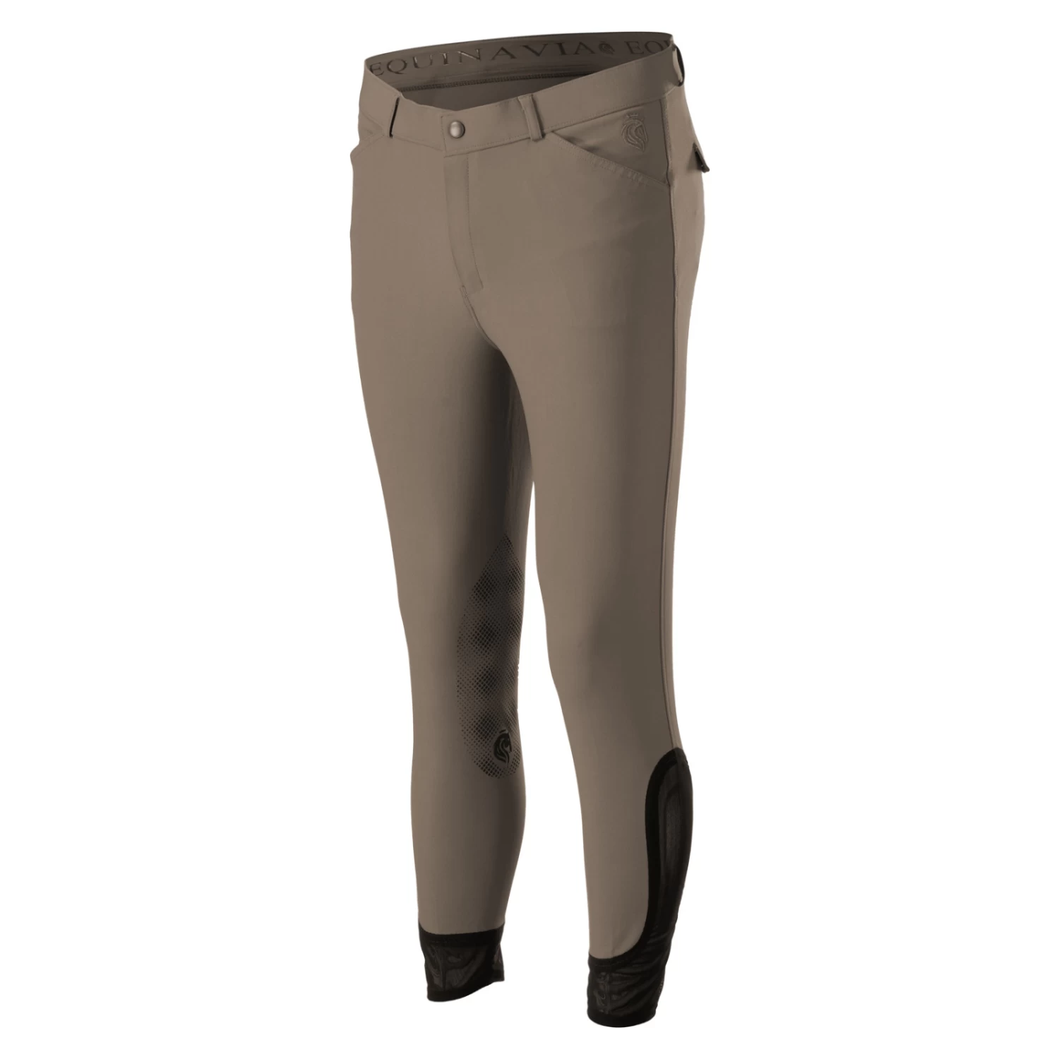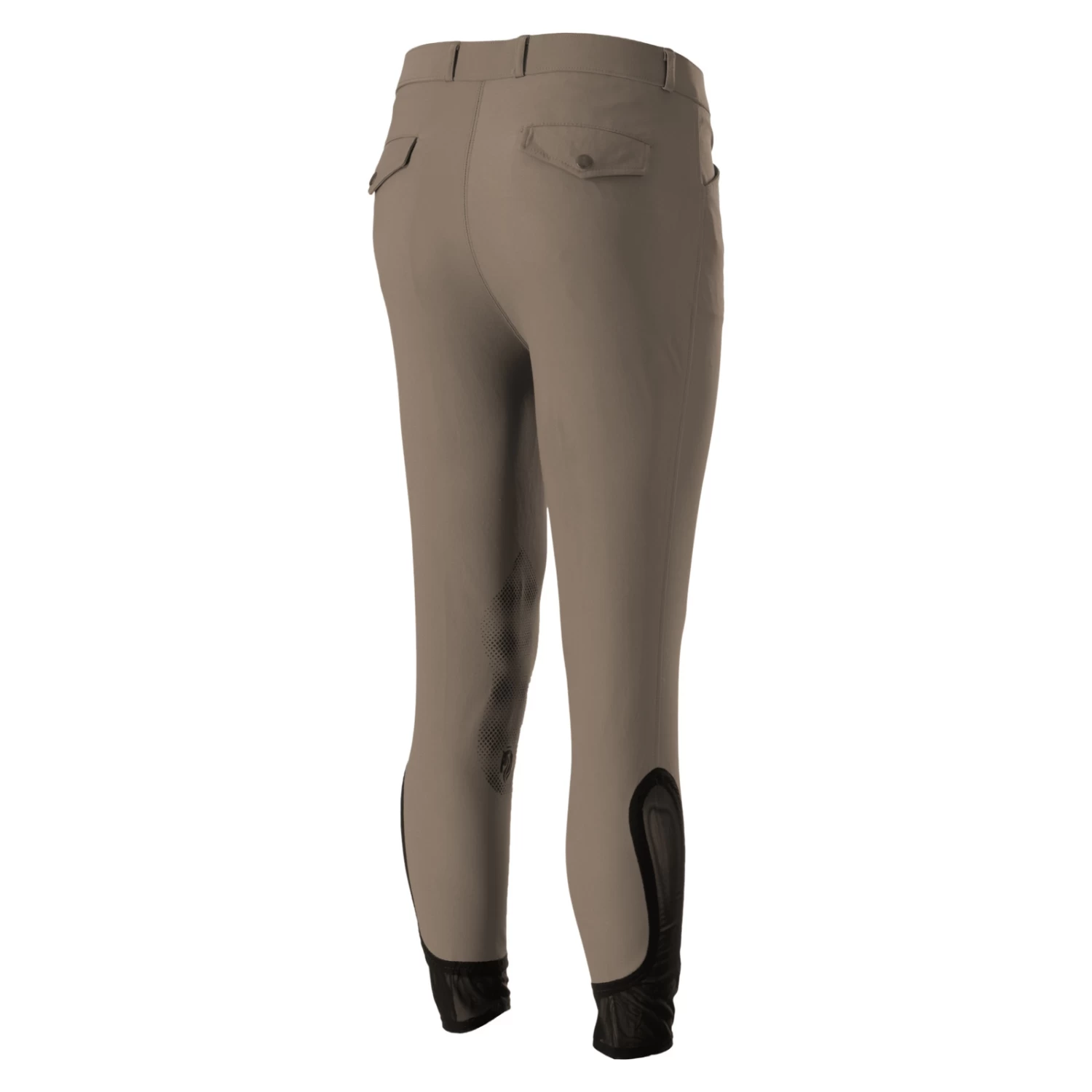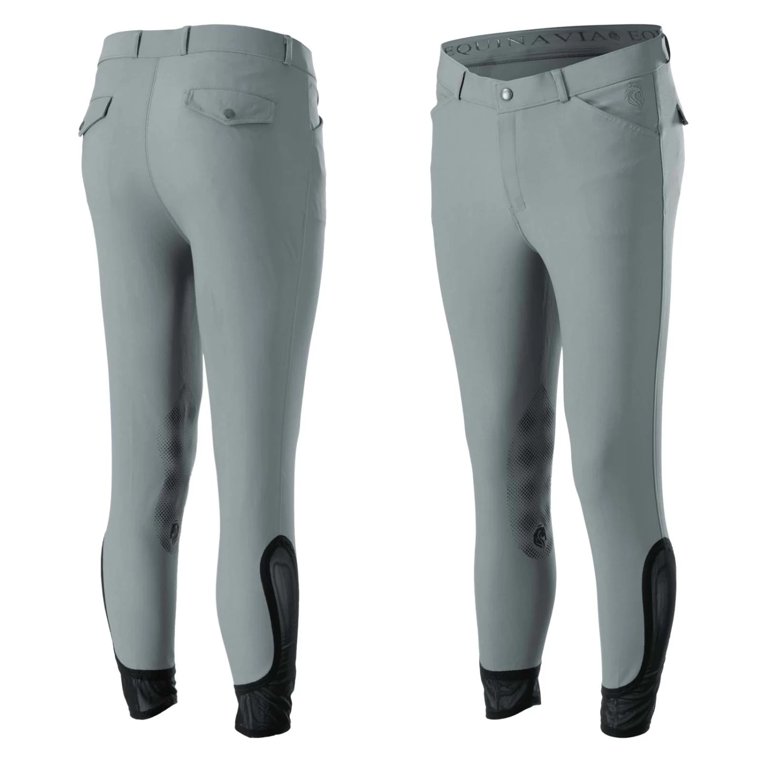 The fabric is high quality technical fabric with a lot of stretch from the spandex and offers moisture-wicking and quick-drying features. Spandex content provides just enough stretch to move with you comfortably and also helps with fabric shape retention and reduces waist gap and saggy knees. The fabric is lightweight, ideal for 3 season wear, and extra comfortable on warmer days. It has two front slash pockets with room for phone and treats along with two back flap pockets. The silicone grip on inner thighs is in a self subtle color for added hold when riding and the silicone grip inside the waist helps to keep shirt neatly tucked in. It features Gutos hook slide closure with internal reinforcement so only fabric touches and there is no hardware to pinch the skin. Durable and stretchy micromesh sock bottoms are added for minimal boot bulk. These are a must have!