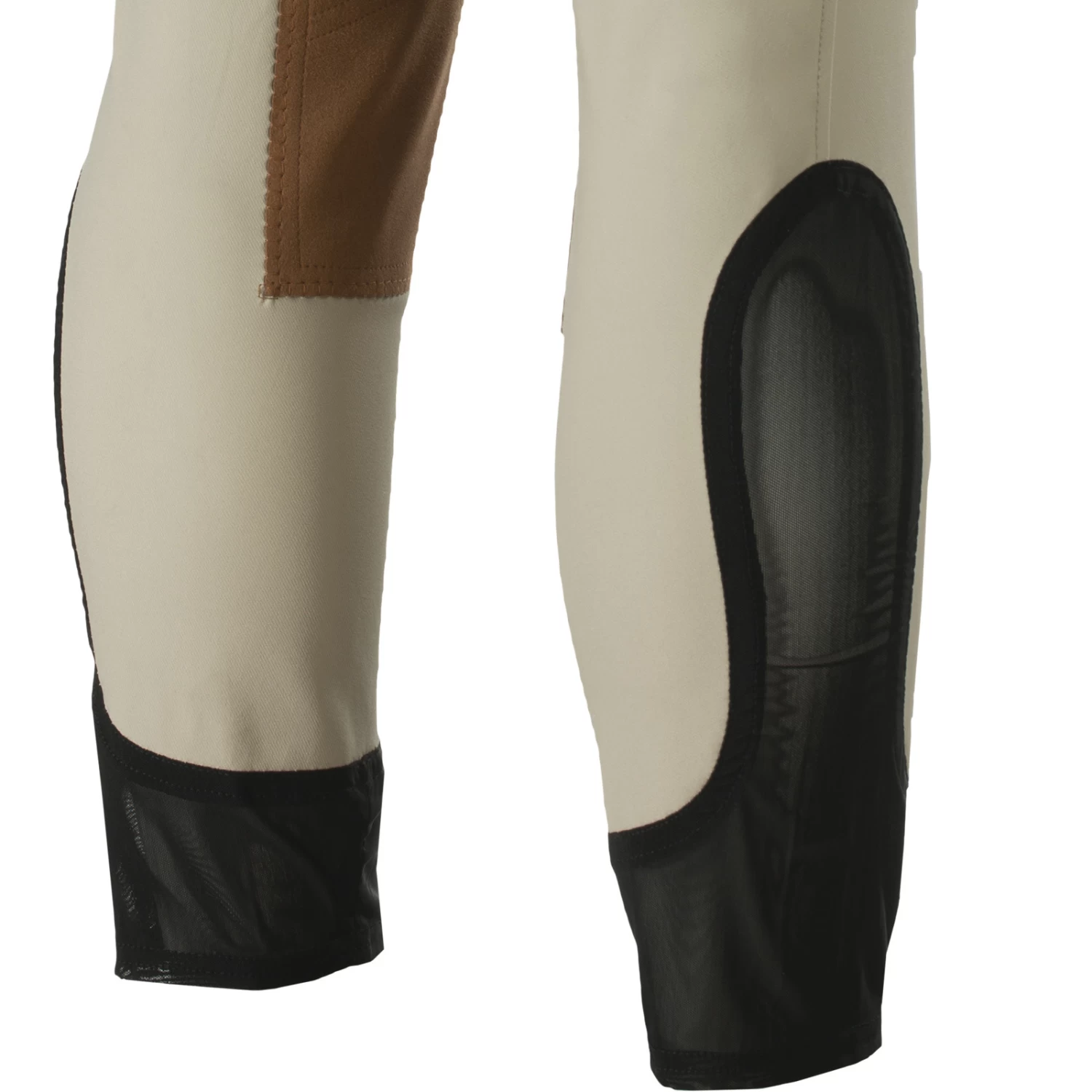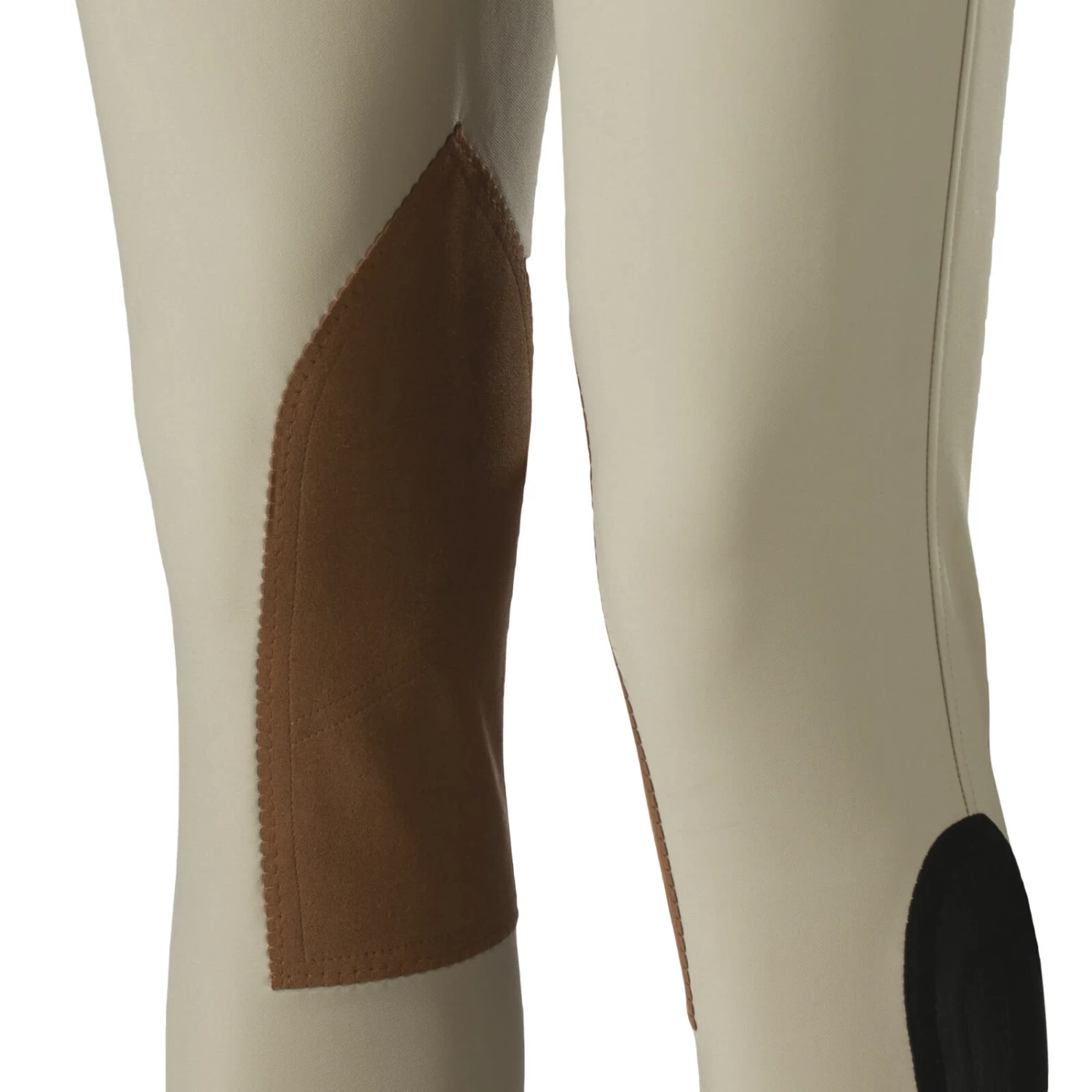 The fabric is high quality technical fabric with a lot of stretch from the spandex and offers moisture-wicking and quick-drying features. Spandex content provides just enough stretch to move with you comfortably and also helps with fabric shape retention and reduces waist gap and saggy knees. The fabric is lightweight, ideal for 3 season wear, and extra comfortable on warmer days. It has two front slash pockets with room for phone and treats along with two back flap pockets. It has a chestnut-colored Ultrasuede knee patch grip in a traditional show tan and the silicone grip inside the waist helps to keep shirt neatly tucked in. It features Gutos hook slide closure with internal reinforcement so only fabric touches and there is no hardware to pinch the skin. Durable and stretchy micromesh sock bottoms are added for minimal boot bulk. These are a must have!