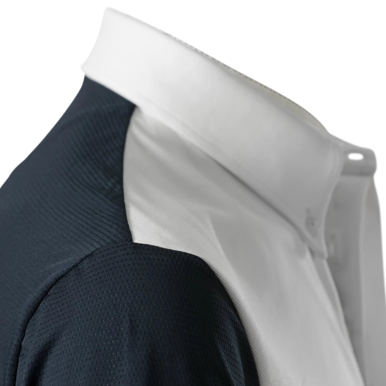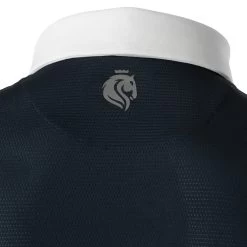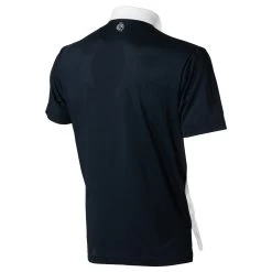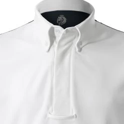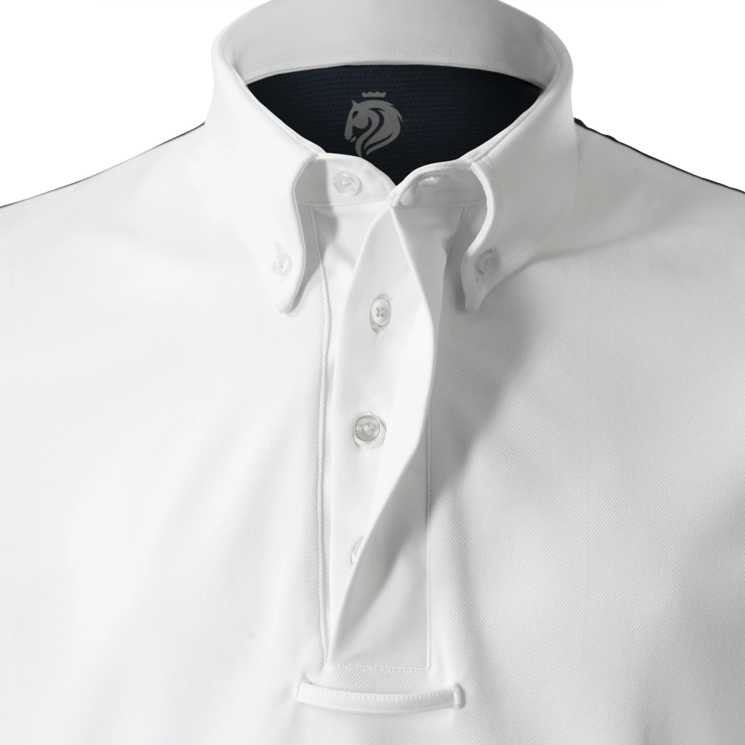 It features a button down collar with covered 4 button placket. It has a tie loop for show days. It is comfortable for warmer days as it is short sleeve and has an extra lightweight perforated navy blue fabric in the back for extra breathability. It is solid white for a traditional look. It is fitted for wear under a coat but can also wear the collar open for casual look after competition.