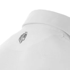 It features a button down collar with covered 4 button placket. It has a tie loop for show days. It is comfortable for warmer days as it is short sleeve and has an extra lightweight perforated navy blue fabric in the back for extra breathability. It is solid white for a traditional look. It is fitted for wear under a coat but can also wear the collar open for casual look after competition.