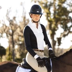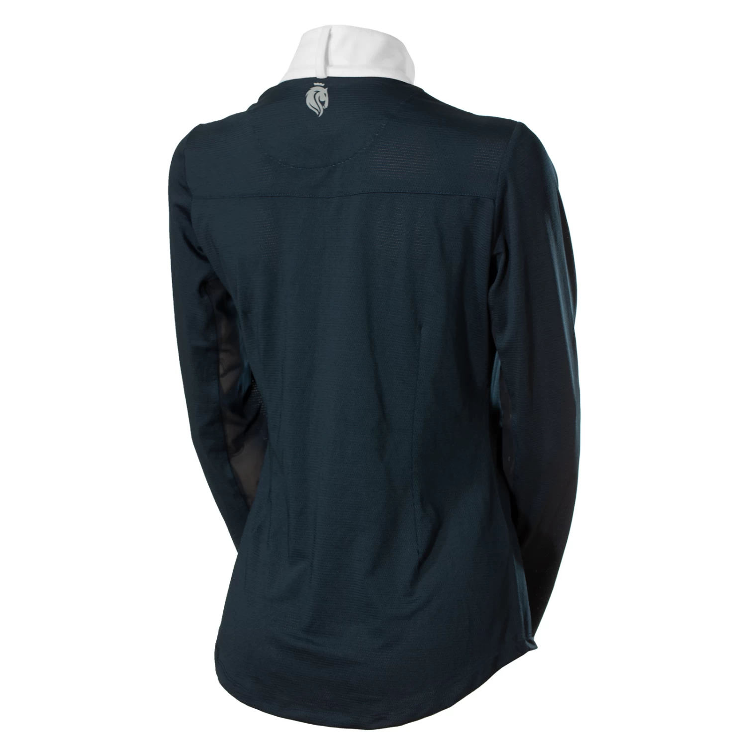 It is very lightwieght and breathable with perforated mesh. It has a correct look for showing, as front of the shirt, cuffs and follar are all solid white. It has a gorgeous fit and contoured hem for a clean show ring look. It has pull on cuffs which means no struggling with buttons or snaps while wearing gloves! It has a stock tie loop in the back of the neck. Overall an amazing shirt with nice design features.