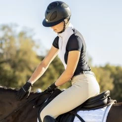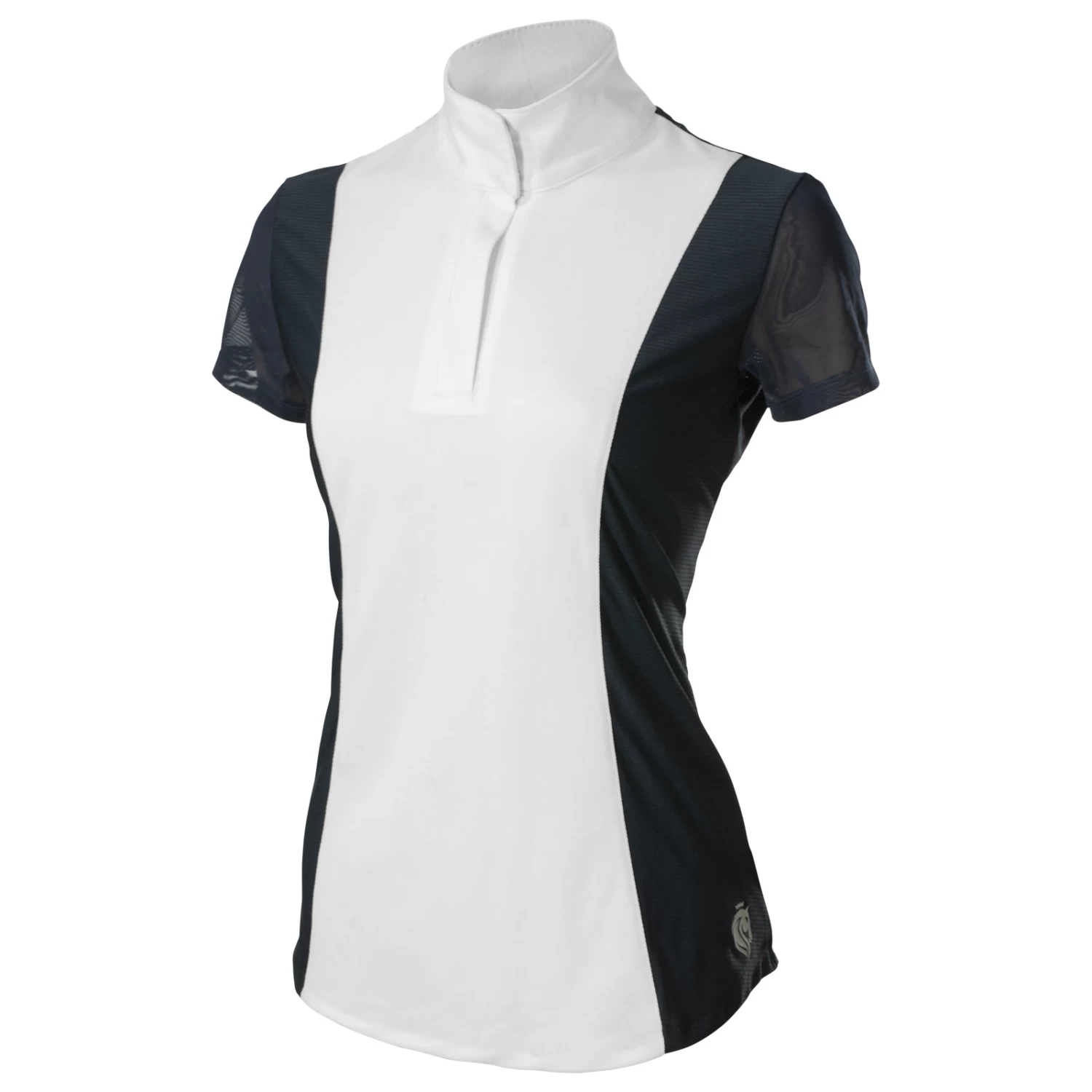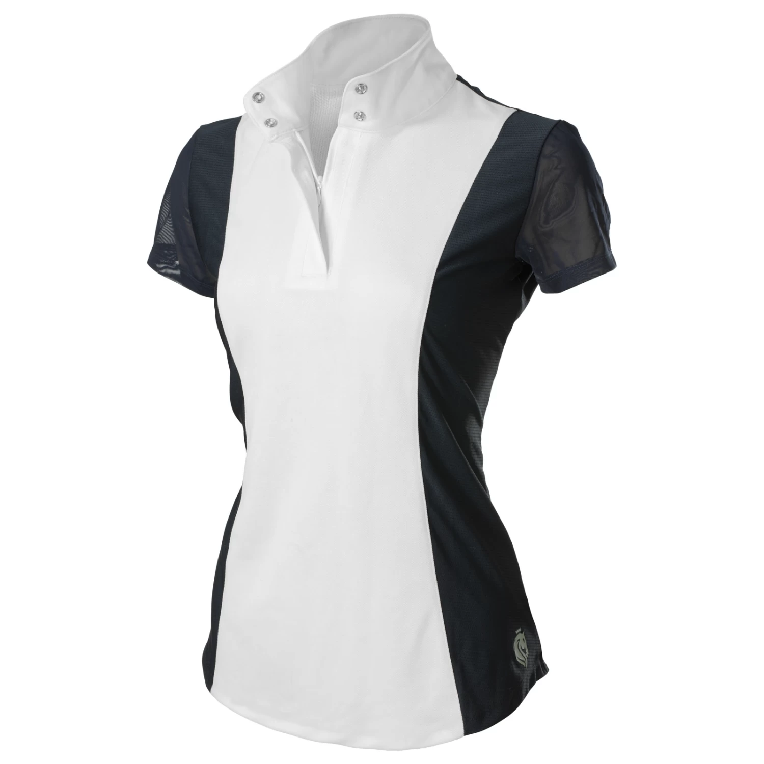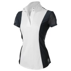 It is very lightwieght and breathable with perforated mesh. It has a correct look for showing, as front of the shirt, cuffs and follar are all solid white. It has a gorgeous fit and contoured hem for a clean show ring look. It has pull on cuffs which means no struggling with buttons or snaps while wearing gloves! It has a stock tie loop in the back of the neck. Overall an amazing shirt with nice design features.