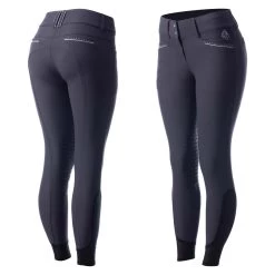 The Equinavia Victoria Womens Silicone Knee Patch Breeches are made of high quality technical fabric that is breathable, moisture-wicking, and quick-drying. Spandex provides stretch for maximum freedom and support while keeping its shape. Silicone grip knee patches offer ultimate security in the saddle, while mesh at the lower legs keeps you cool and streamlined underneath the boots. Finished with a silver lurex logo on the left pocket as well as silver piping and crystals on the front pocket and the back fake pocket will make you stand out in the ring.
