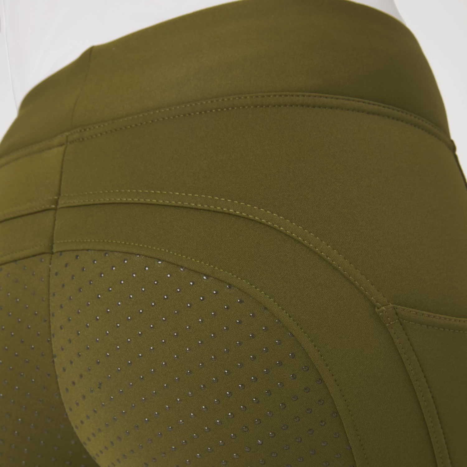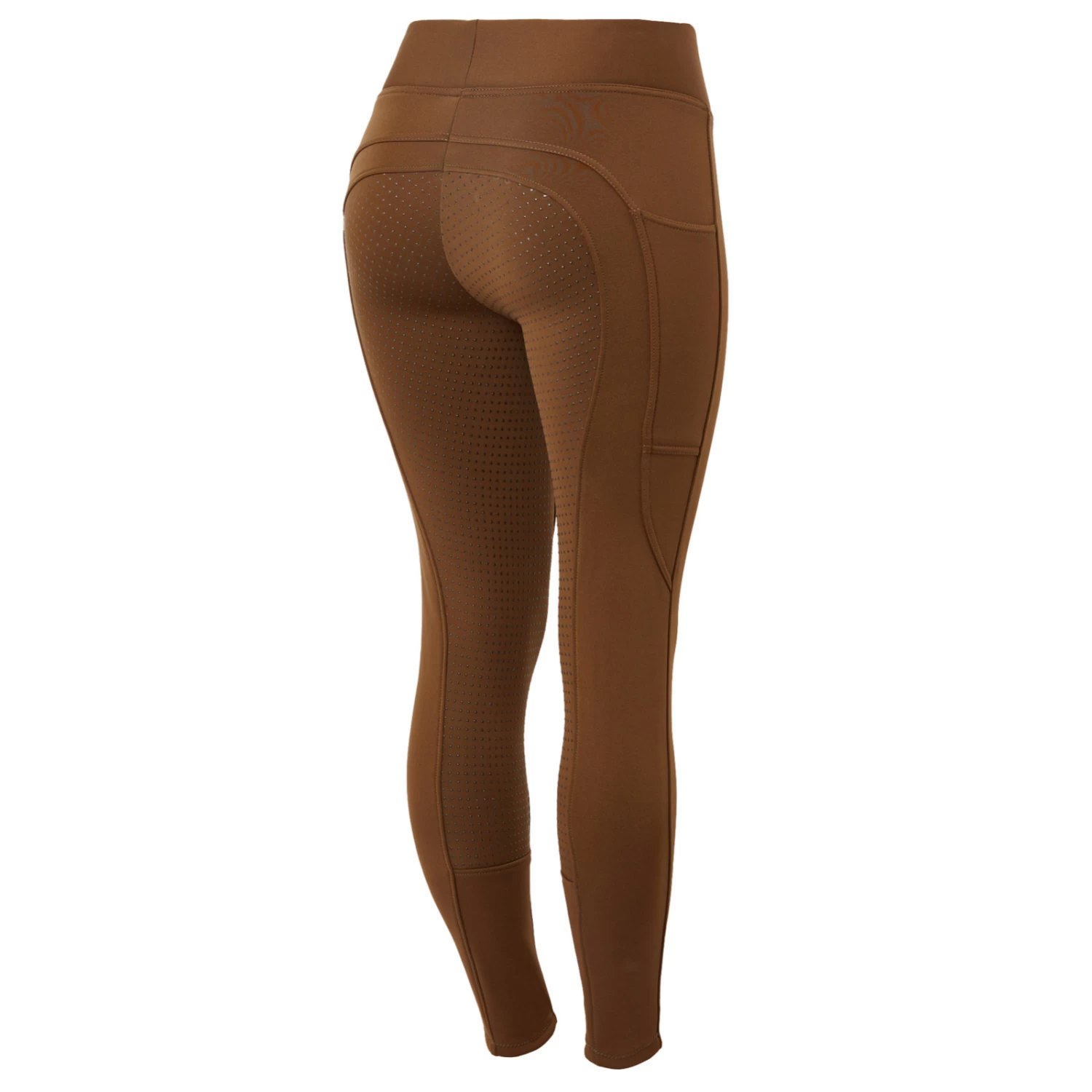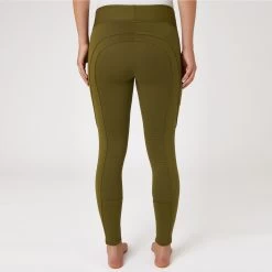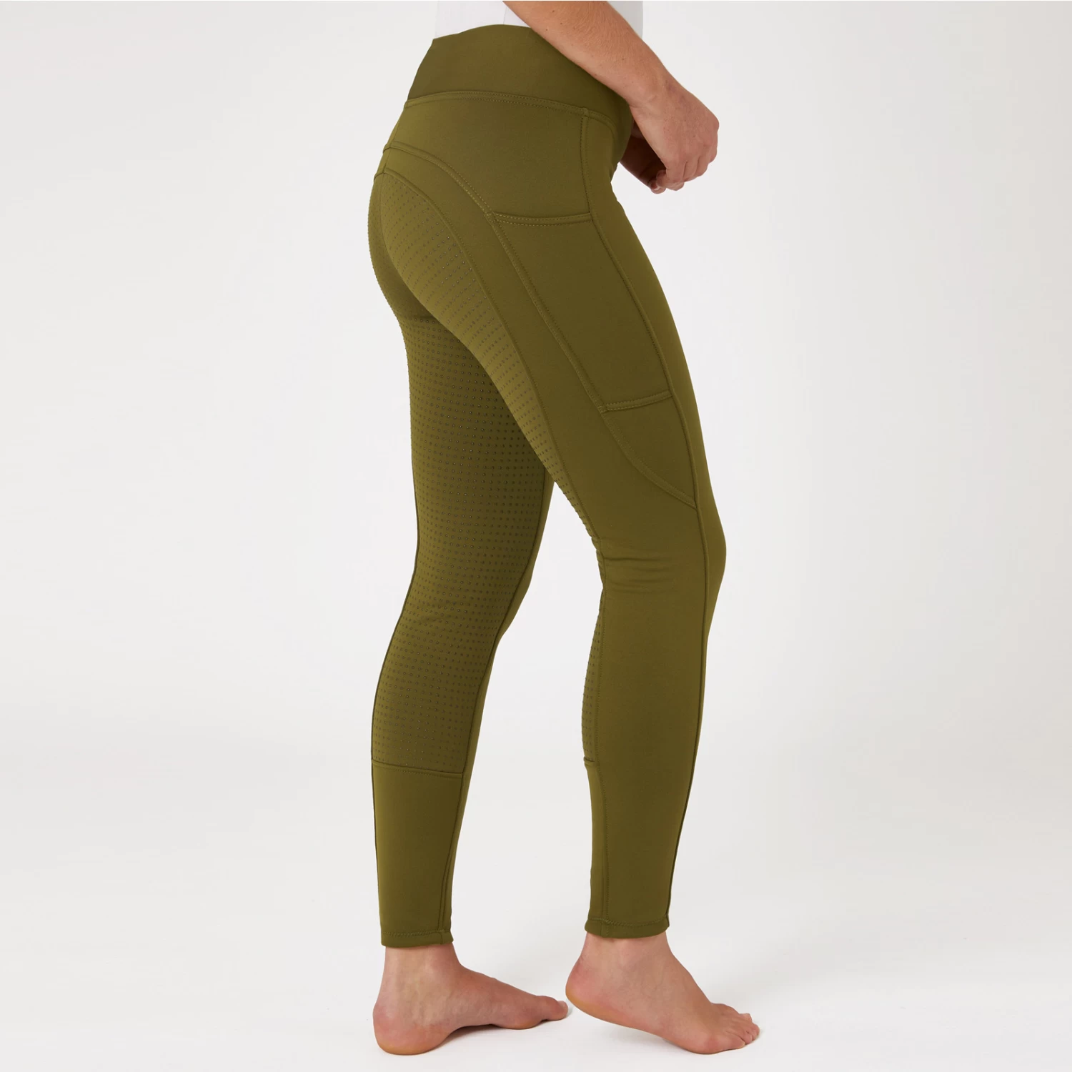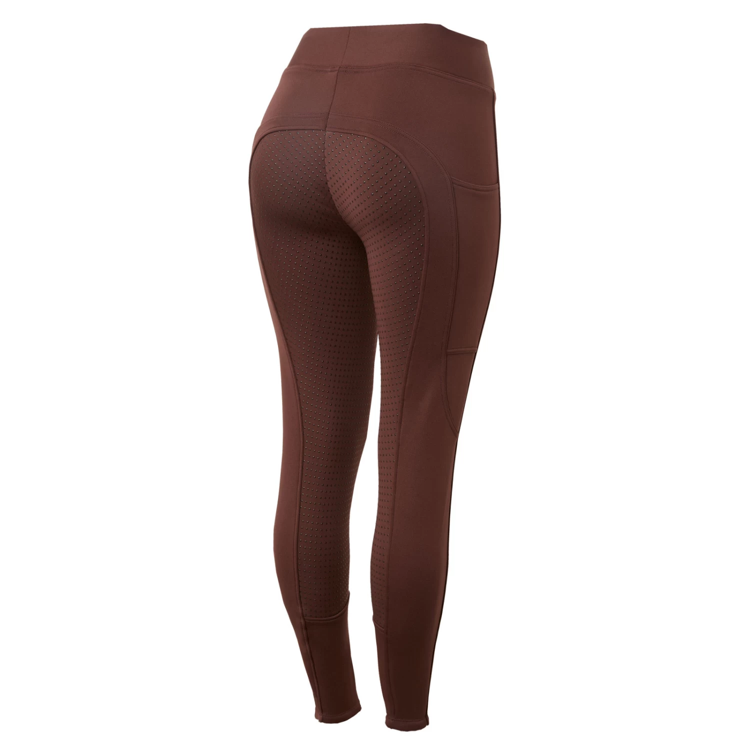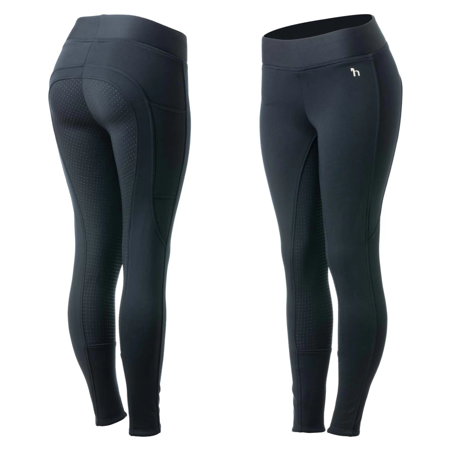 The soft, breathable fabric with brushed fleece lining is ideal for holding warmth in to keep you feeling cozy even on cold weather rides. The mid-rise waist is perfect for layering and the simple front closure won’t feel binding in the barn or in the saddle. For added security, the silicone full seat adds a little extra grip to keep you secure in the saddle on those days when your horse is feeling a little frisky.