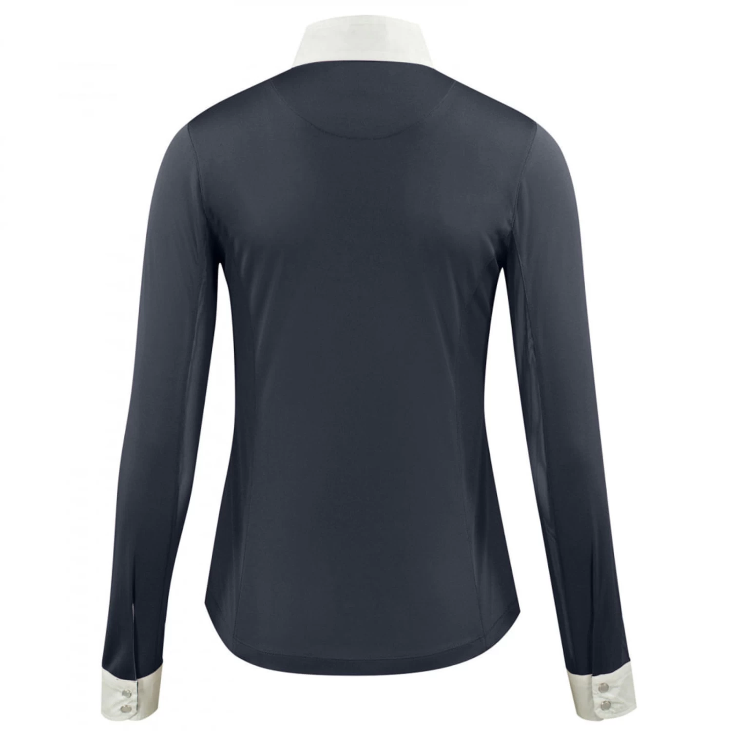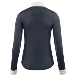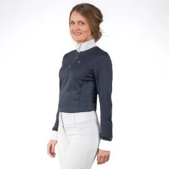 This beautiful and classy show shirt is designed with your comfort and performance in mind. Featuring many technical details like the soft and stretchy fabric with added UV protection, mesh under arms for excellent breathability, quick-drying material, and a fitted style, this stylish competition shirt looks and feels great under your show coat. Choose from a variety of unique or traditional colors and enjoy the fun print inside the collar. The hidden snap buttons on the collar and sleeve cuffs create a smooth, pulled together look that’s perfect for the show ring.