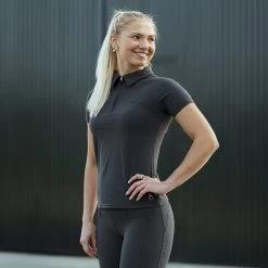 The functional and soft Horze Ciandra shirt is perfect for active riding. Quick-drying fabric is breathable with mesh details at the front. The shirt also protects you from the sun. The front zipper adds ventilation and comfort. Small gold details add an elegant touch. Pair this shirt with our Horze Ciandra riding tights, training jacket and riding gloves for a full outfit.