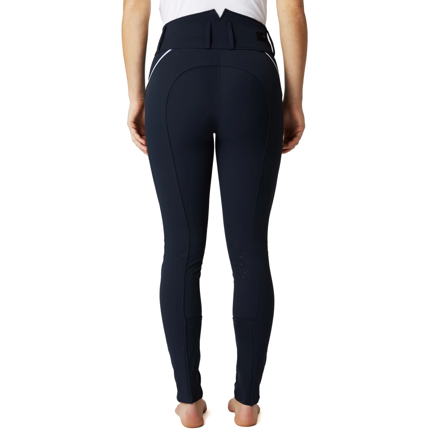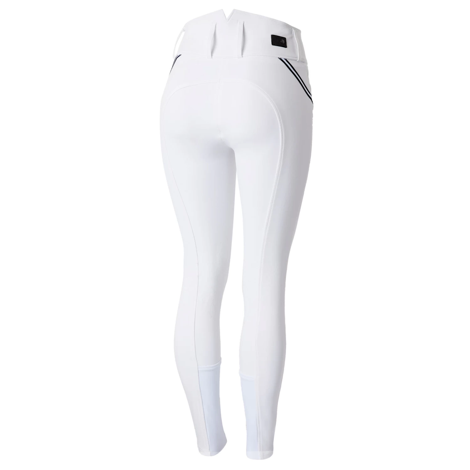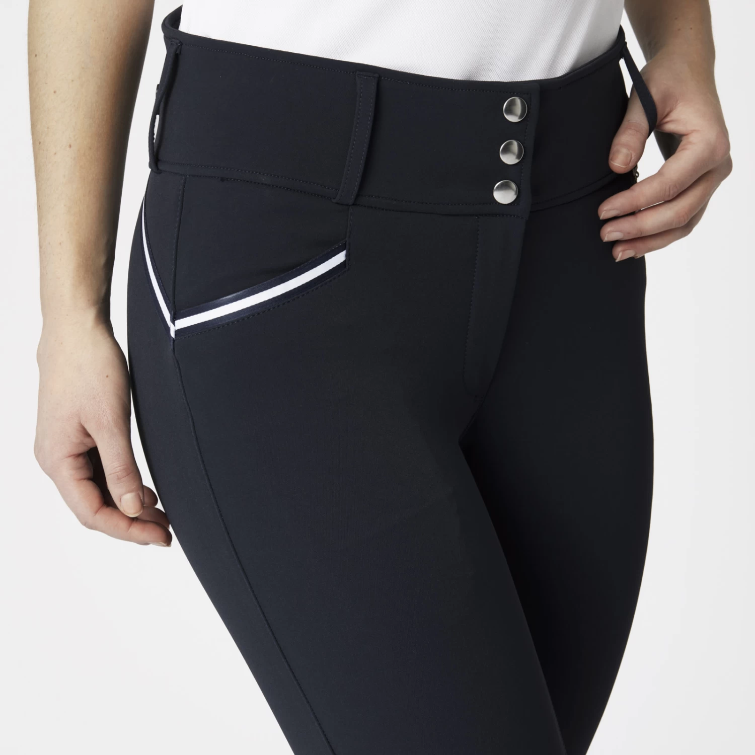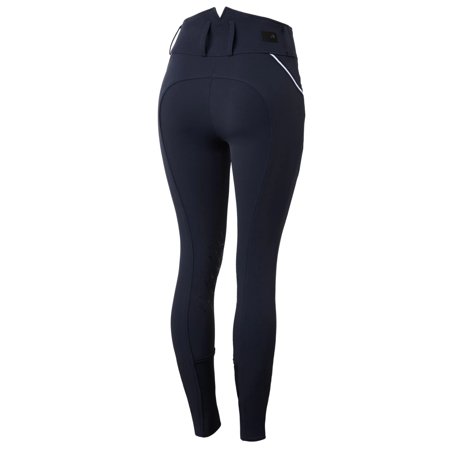 The Horze Della breeches are equipped with a high waist and designed in classic shape and colors. Contrast piping looks flattering, and the silicone knee patch provides flexibility the saddle. Also available with full seat (#36681).