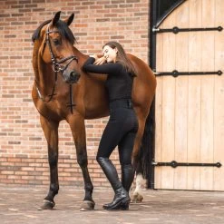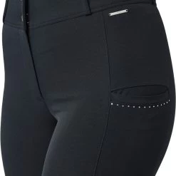 These breeches are crafted from an all-season fabric that ensures durability and breathability for year-round riding. The crystal lines on the pockets add a touch of elegance, while the silver logo print at the back waist enhances the overall look. With a silicone full grip, these breeches provide excellent stability in the saddle. The two buttons at the front closure and the comfortably wide waistband offer a secure and comfortable fit.