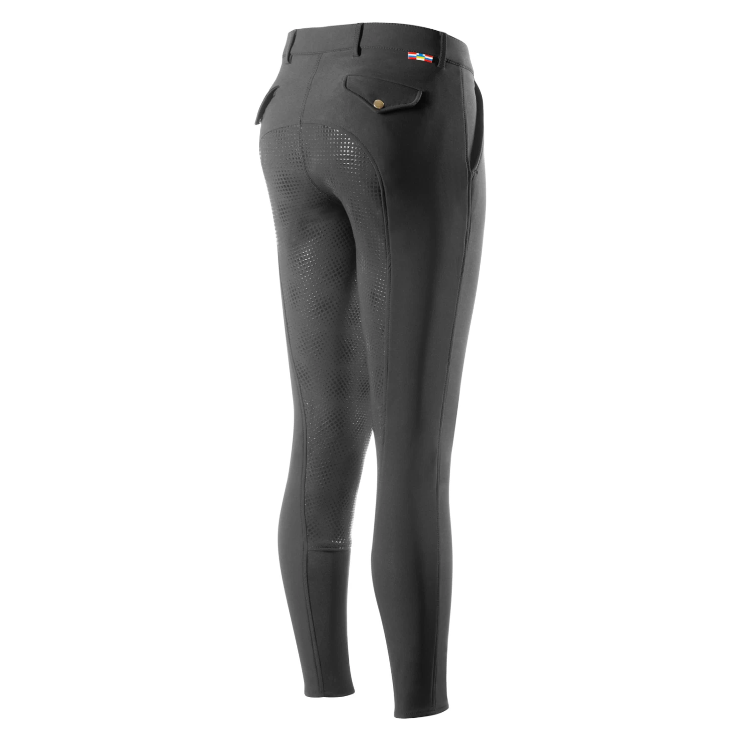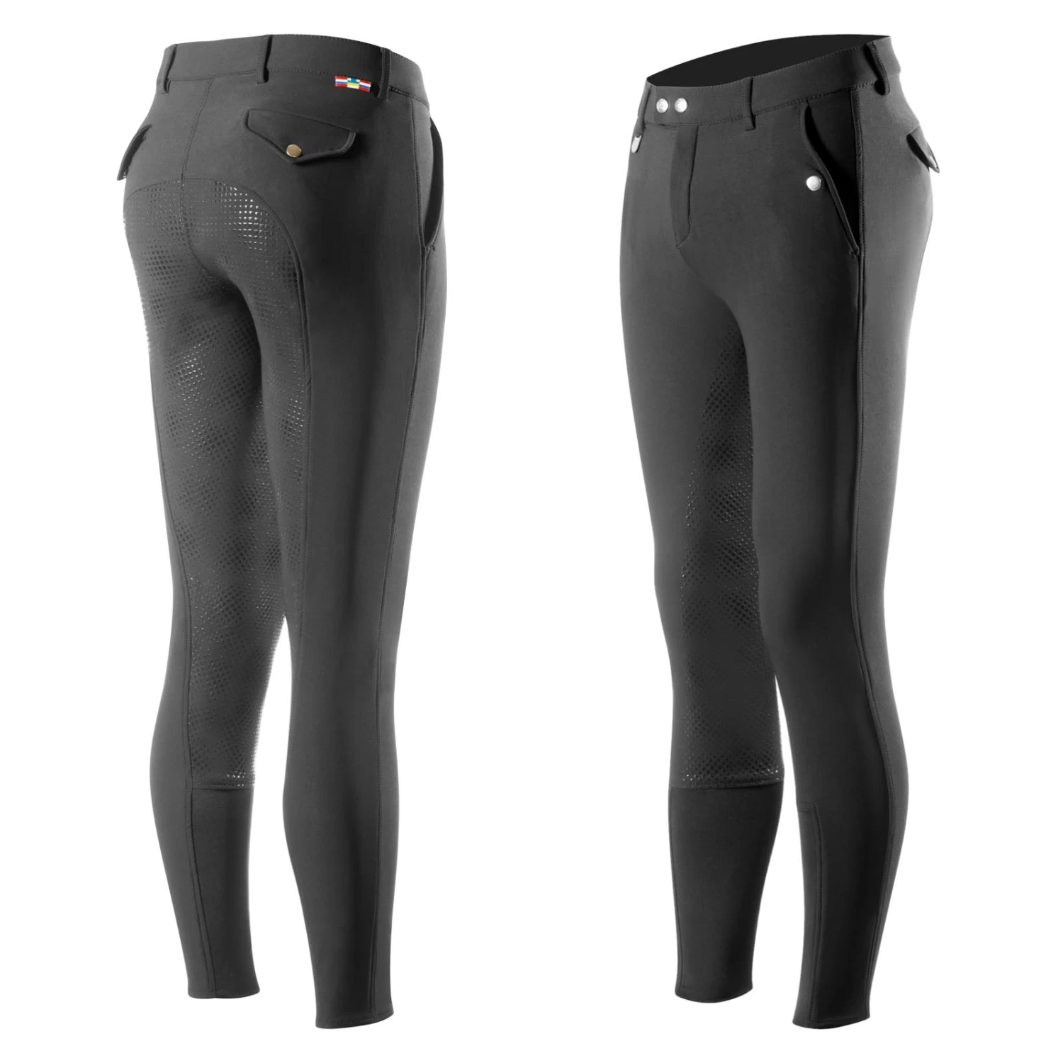 The Horze Men’s Grand Prix Full Seat Breeches with Silicone Grip are new full seat, Grand Prix style breeches that now have a contoured waistband for an improved fit. A high-quality, silicone print full seat provides a solid grip. The elastic leg bottoms provide a smooth and comfortable fit on the calf/ankle when wearing tight-fitting tall boots. These classic styled, men’s, silicone grip, full seat breeches, by Horze, also feature a new functional, breathable fabric with a water and dirt repellent surface.