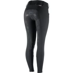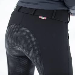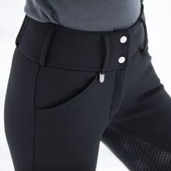 The Horze Women’s Grand Prix Thermo Softshell Full Seat Breeches will be your favorite cold weather riding breech. These new and improved Grand Prix-styled riding pants are water repellent and designed with a full silicone seat for great grip in the saddle. These fleece-lined wide waist breeches provide that extra layer of warmth you need for winter riding. The stretchable, breathable soft-shell fabric repels hay and horse hair so you will always look neat and clean. The full seat allows plenty of freedom of movement and the elastic leg bottoms provide a smooth fit under tight boots or chaps. Horze’s Grand Prix Thermo Softshell Breeches include a comfortable wide waistband and front zipper. Two front pockets are also designed.
