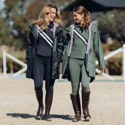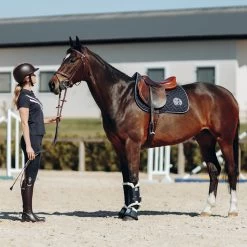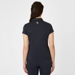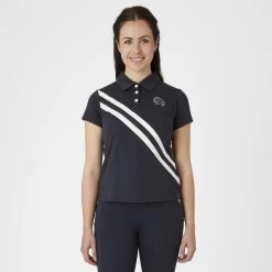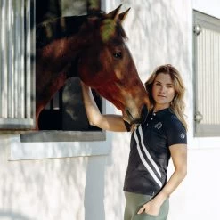The Horze Jessie t-shirt is made from breathable material that is perfect for your daily rides. The sporty design with collar and contrasting stripe easily matches your riding wardrobe. Press buttons at the placket provide additional ventilation when needed. The embroidery on the chest looks timeless and chic. Wear this jersey shirt riding, in the stables or in your free time. It can easily be combined with breeches, tights or jeans.
