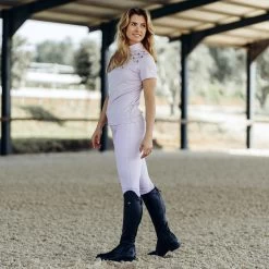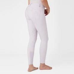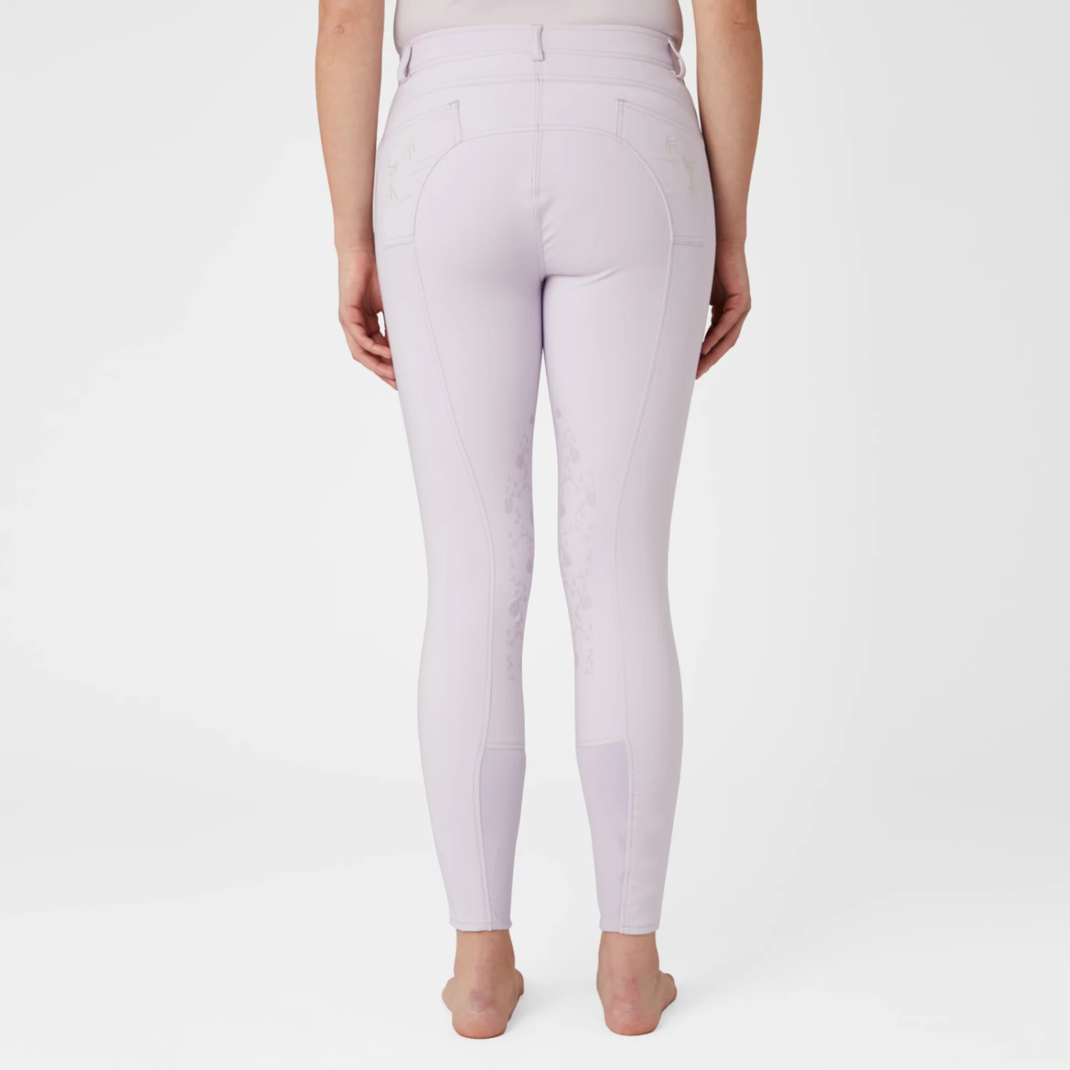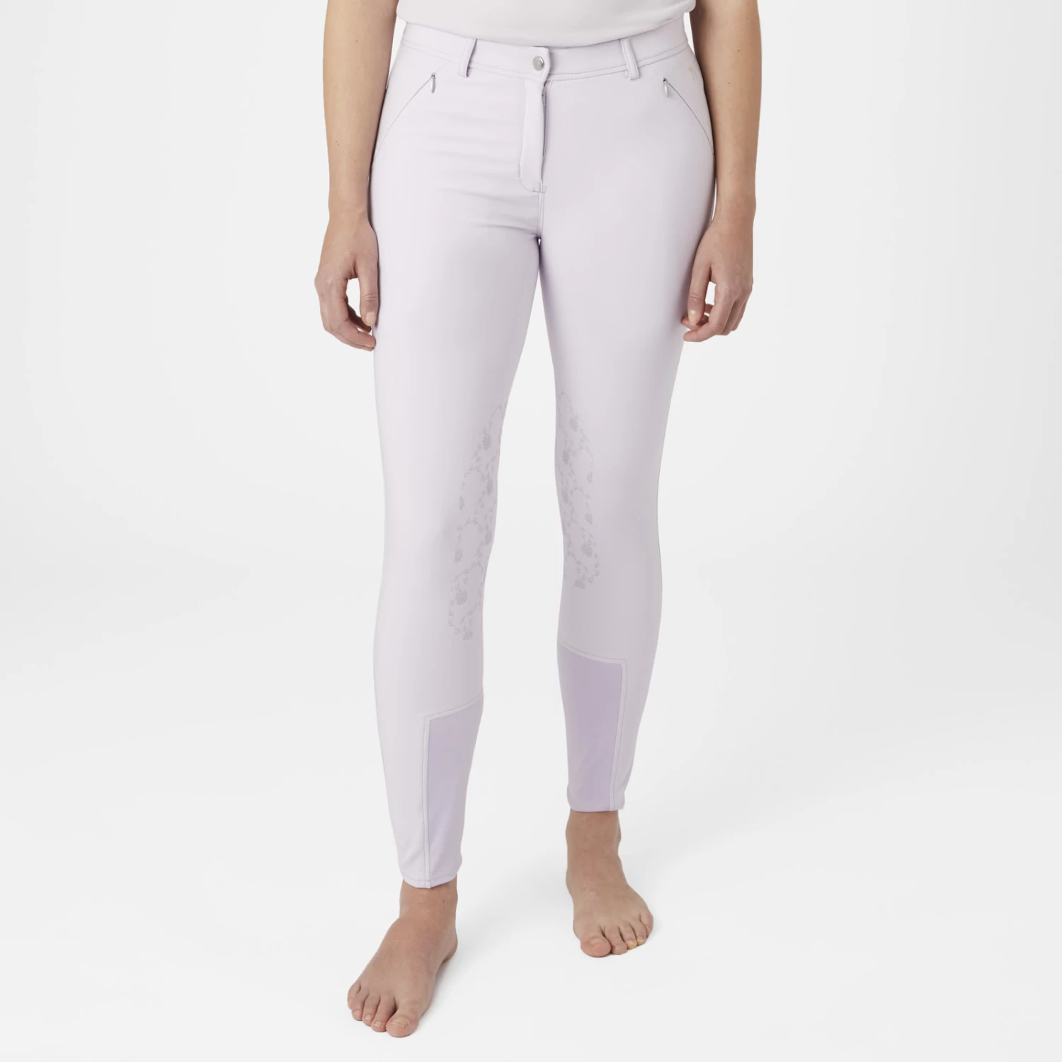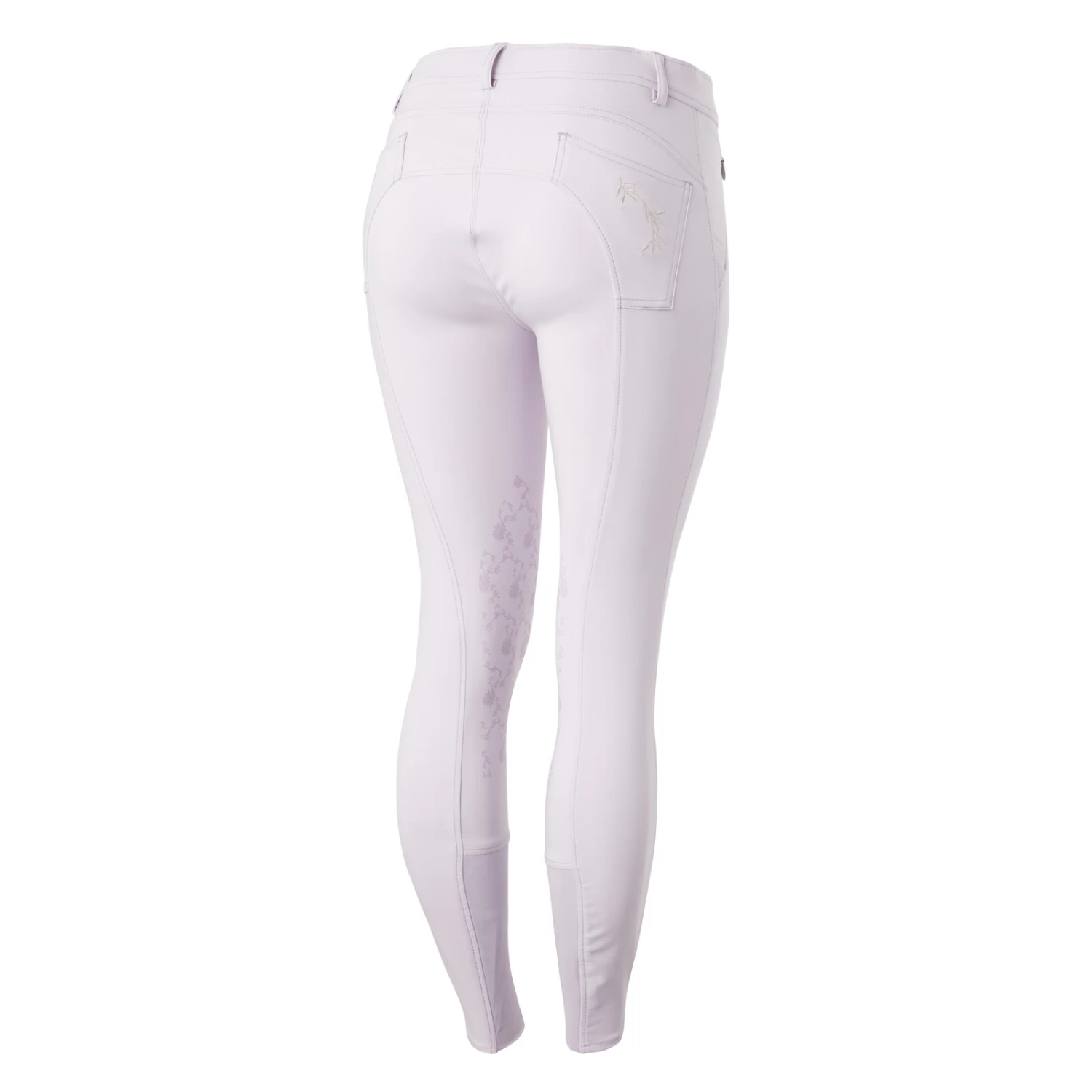 The Horze Kaitlin breeches are made from soft, stretchy material. Front pockets with zippers keep your phone safe. The back pockets are embroidered with silver leaves, matching the floral silicone knee patch. Muted colors fit your riding wardrobe perfectly.
