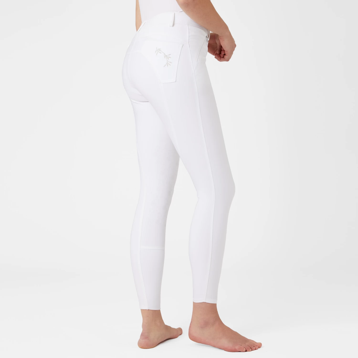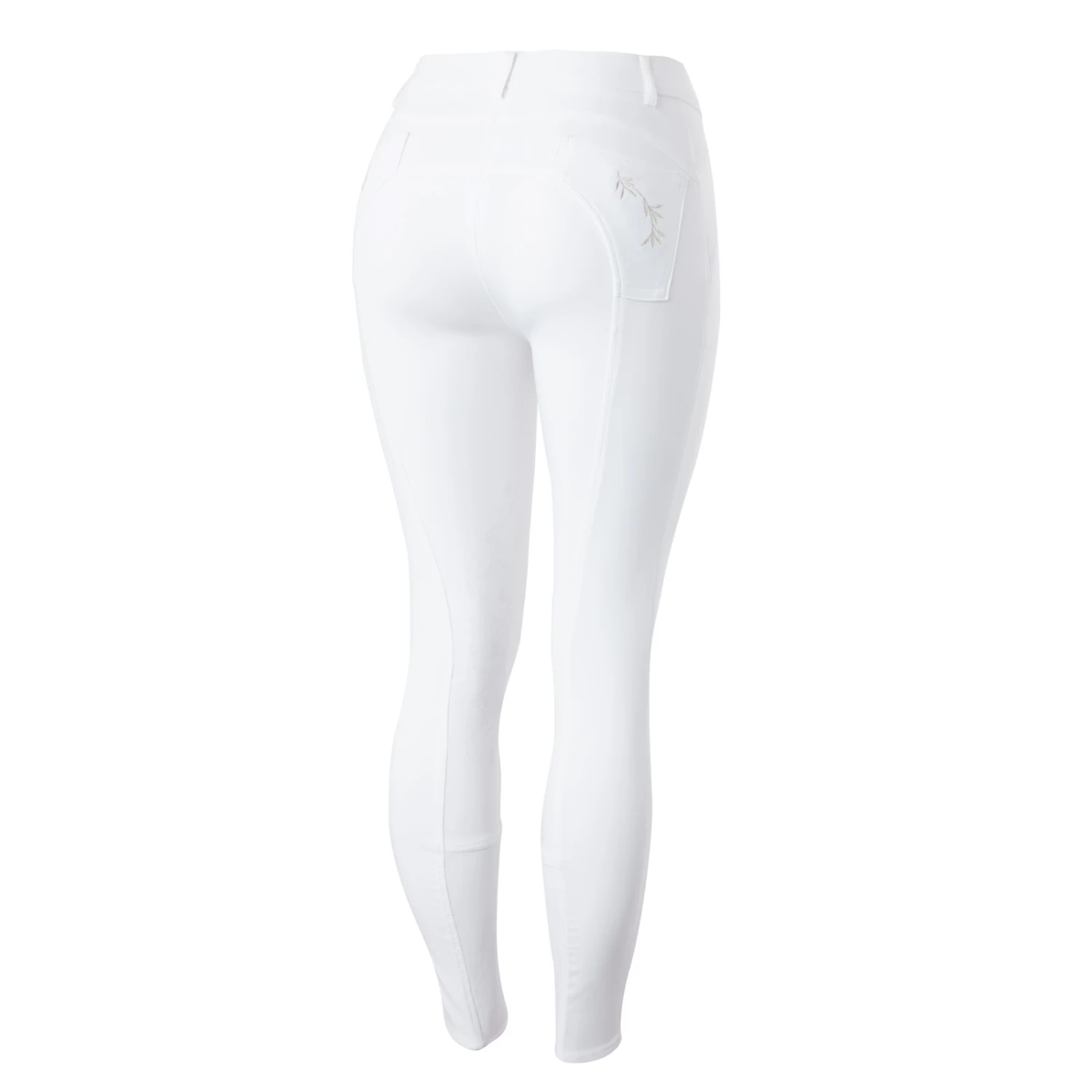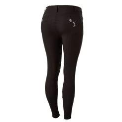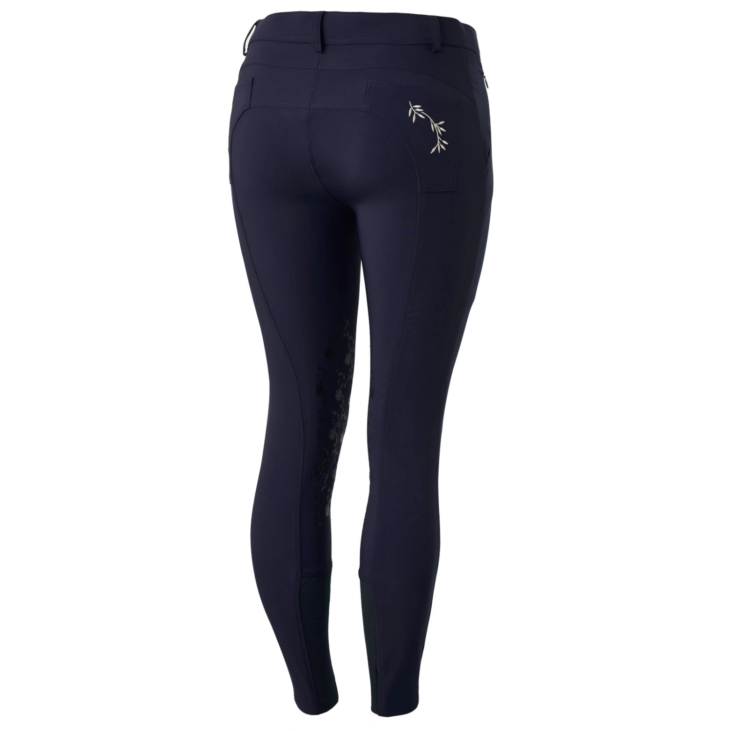The Horze Kaitlin breeches are made from soft, stretchy material. Front pockets with zippers keep your phone safe. The back pockets are embroidered with silver leaves, matching the floral silicone knee patch. Muted colors fit your riding wardrobe perfectly.