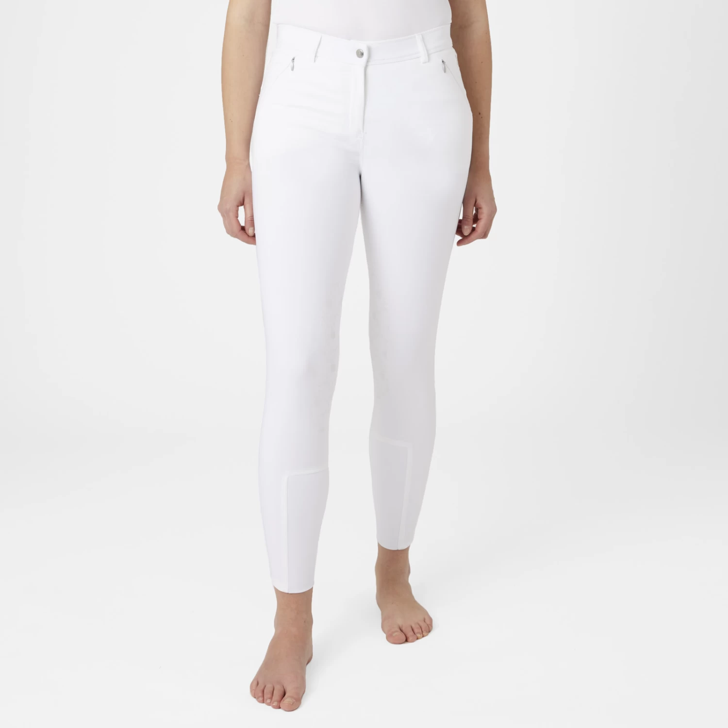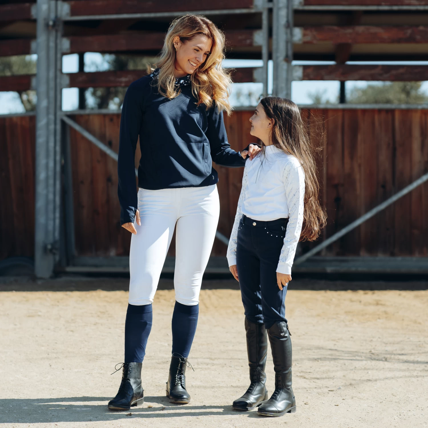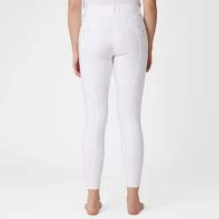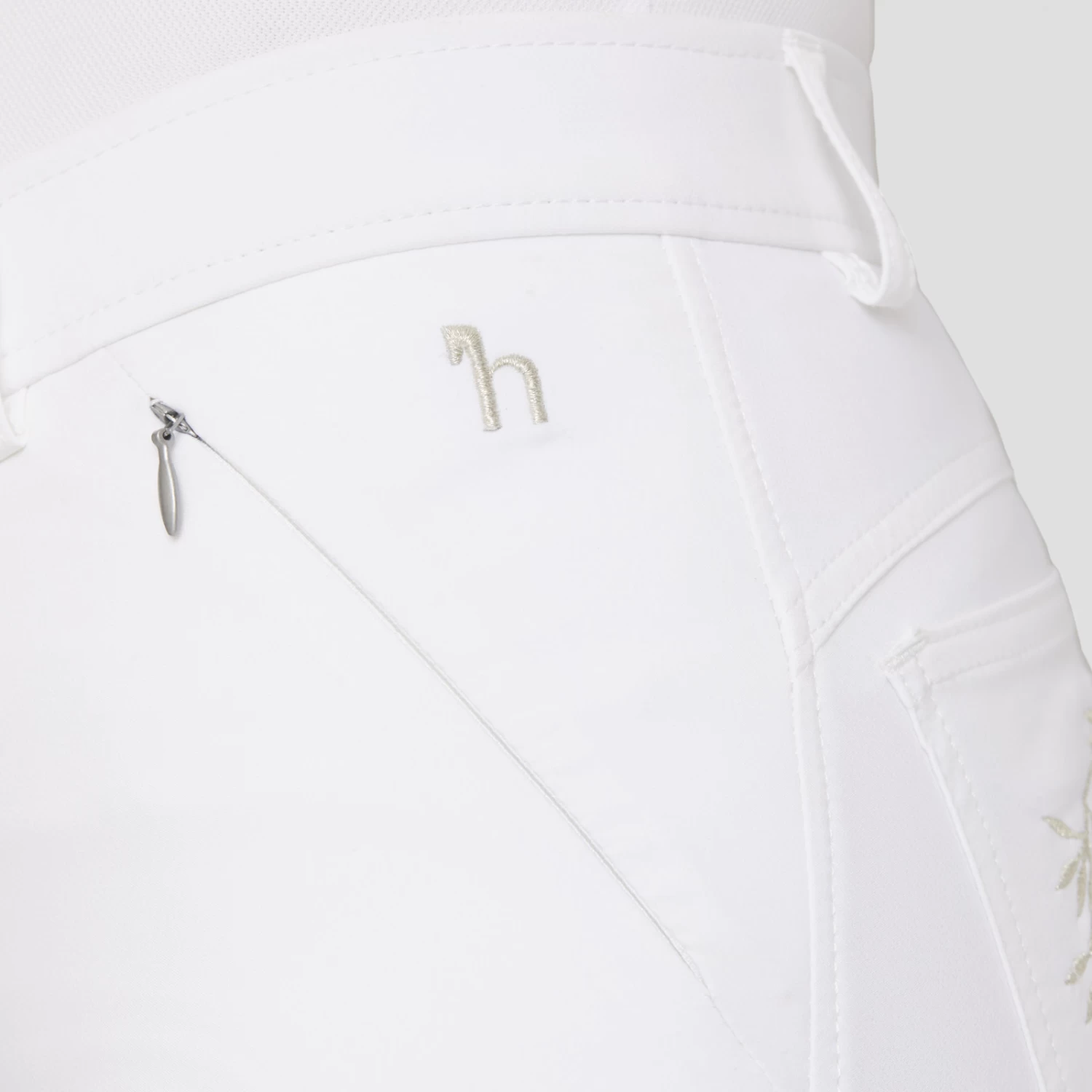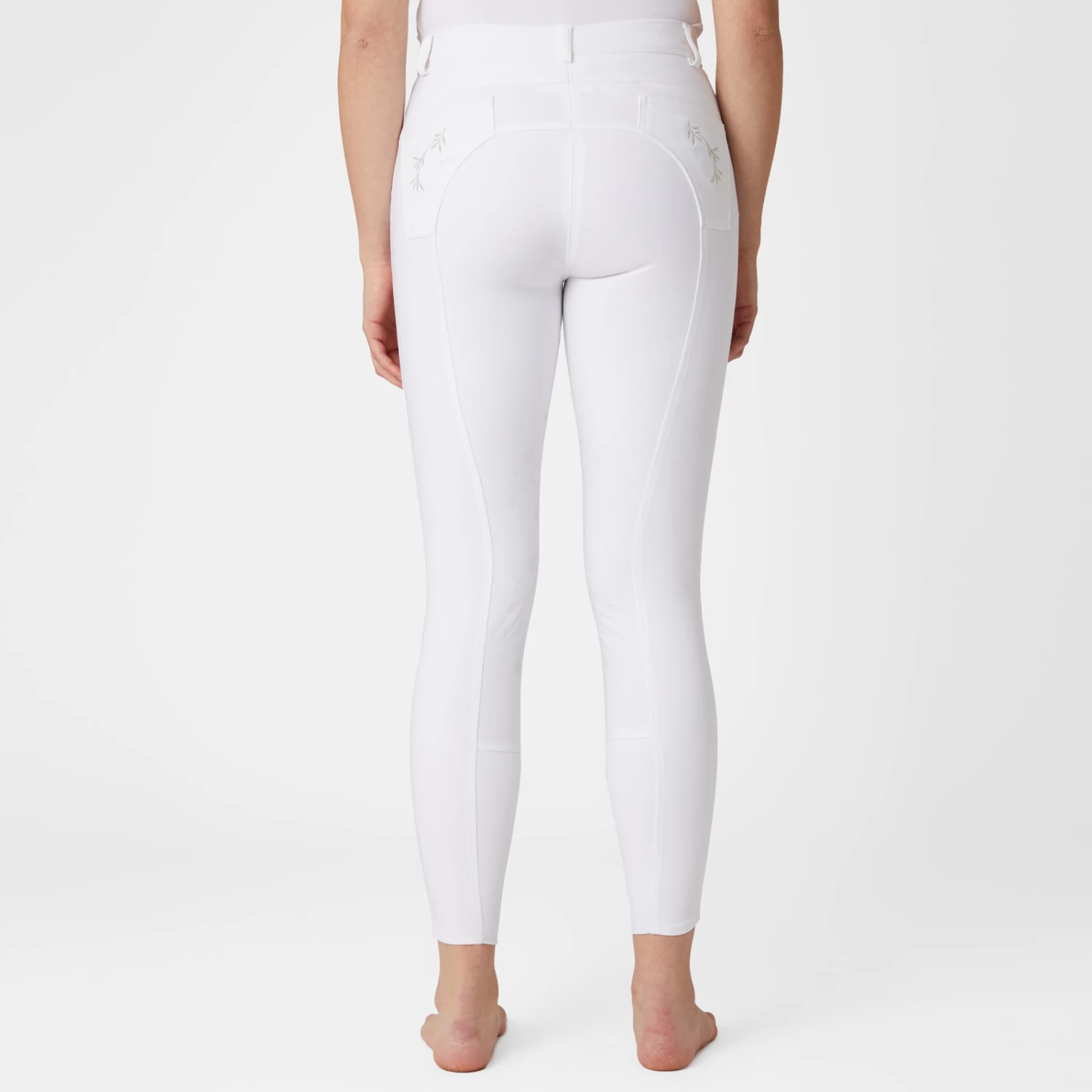 The Horze Kaitlin breeches are made from soft, stretchy material. Front pockets with zippers keep your phone safe. The back pockets are embroidered with silver leaves, matching the floral silicone knee patch. Muted colors fit your riding wardrobe perfectly.