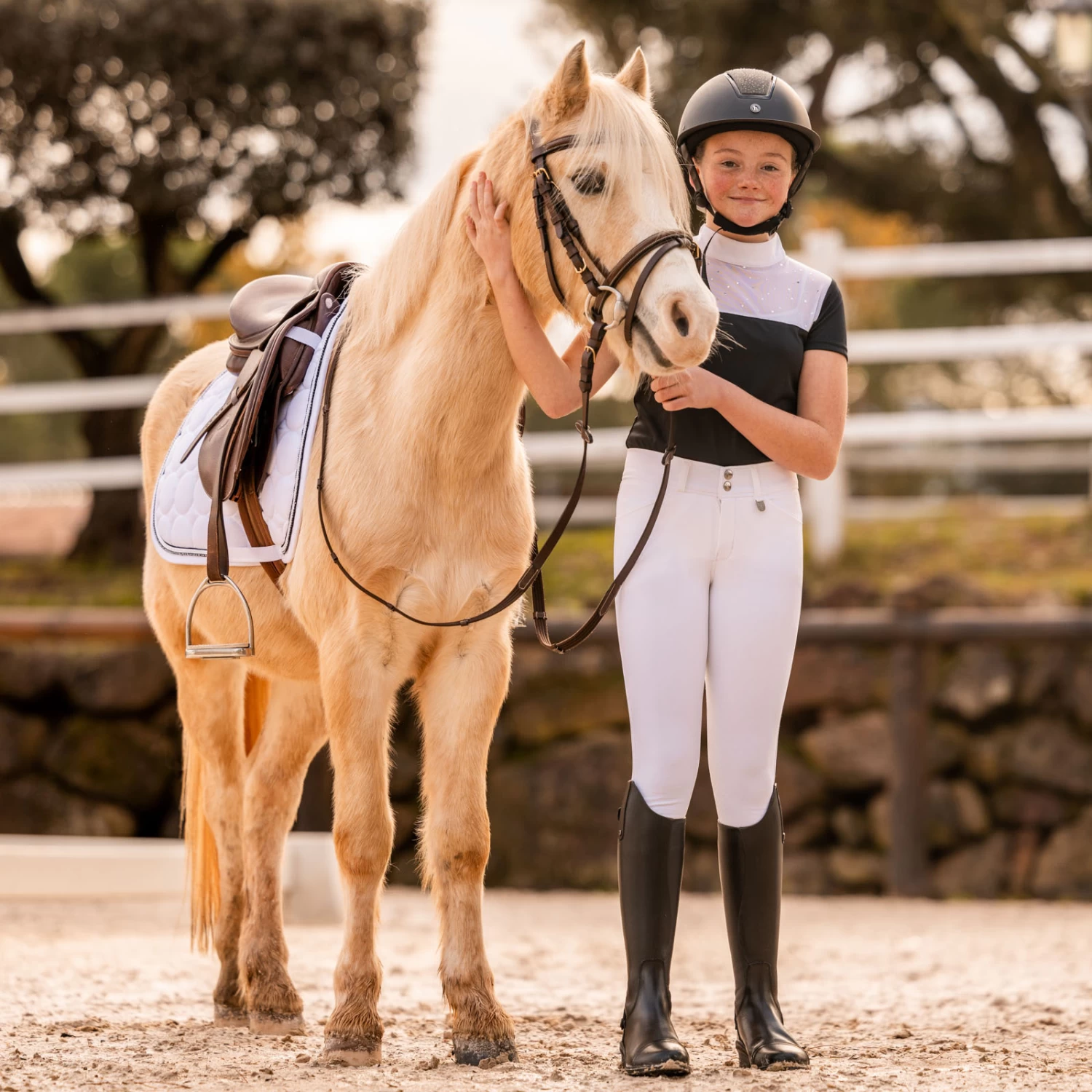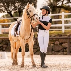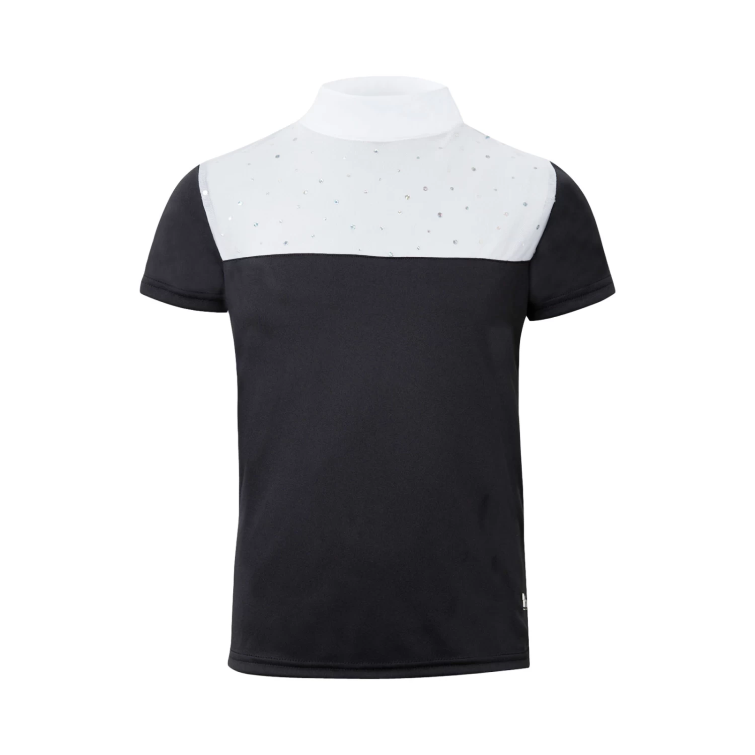 Breathable and quick drying functional fabric makes this show shirt comfortable to wear for your child. The upper front is made of mesh and is adorned with rhinestones for that bit of extra sparkle in the arena. For easy on and off, the shirt has a half zip at the back.