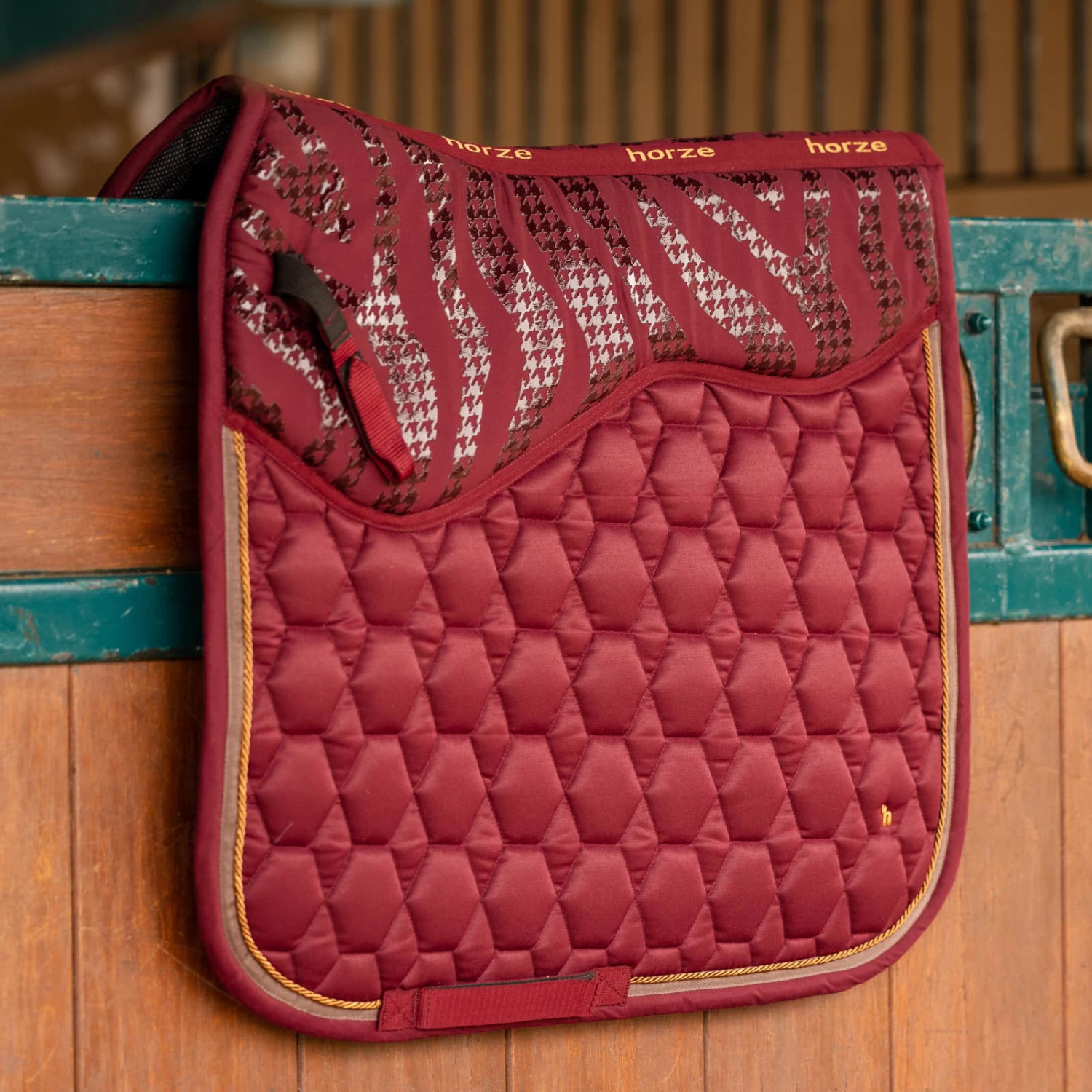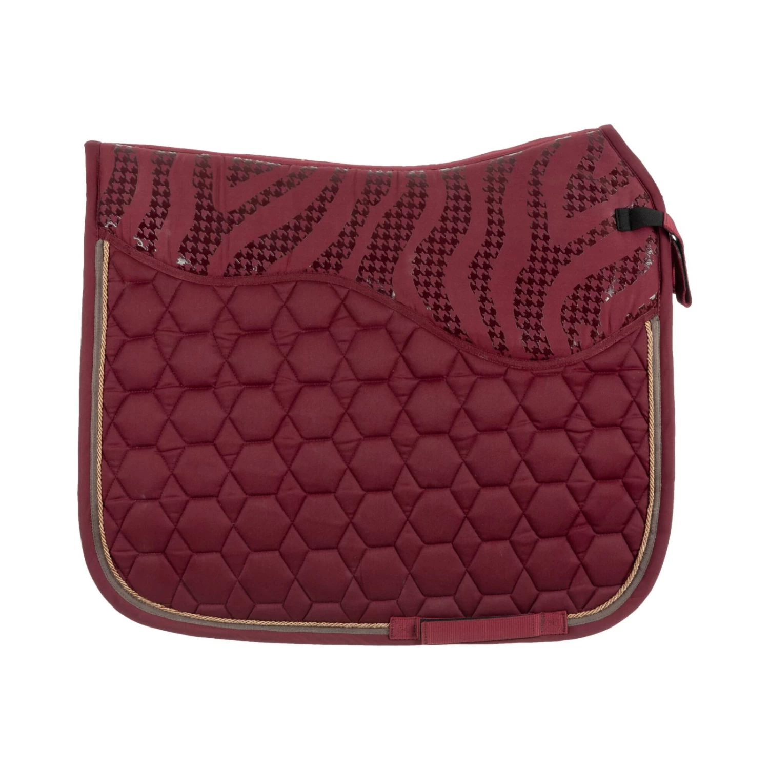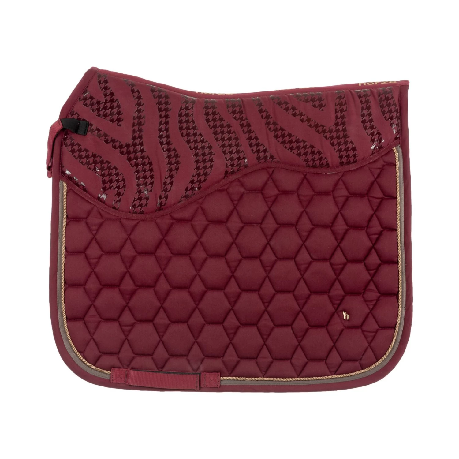 The anatomically cut Horze Kenya saddle pad is equipped with a silicone detail to prevent the saddle from slipping. Light padding beneath the saddle adds comfort. Moisture wicking lining keeps your horse’s back dry. Three rows of pipinig and the timeless design add a classic look. Metallic details make for an elegant look. Pair this saddle pad with the rest of our Horze Kenya range for a full outfit.