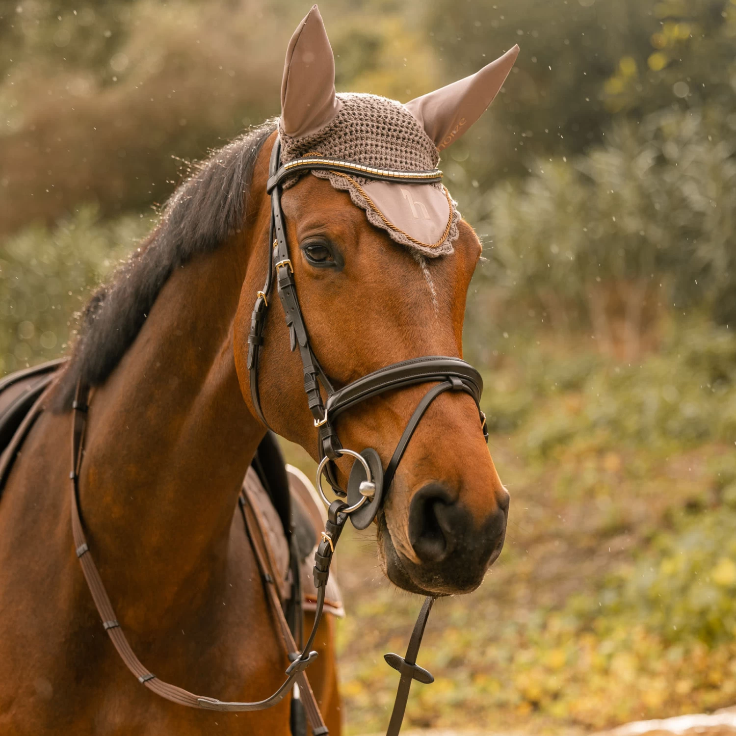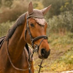 Our Horze Kenya ear net is made from soft crochet material with elastic ears that are breathable and quick-drying. Elegant rope looks timeless and pretty. Metallic accents add a shiny detail. Pair this ear net with the rest of our Horze Kenya range for a matching look!