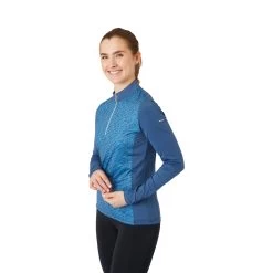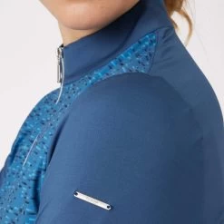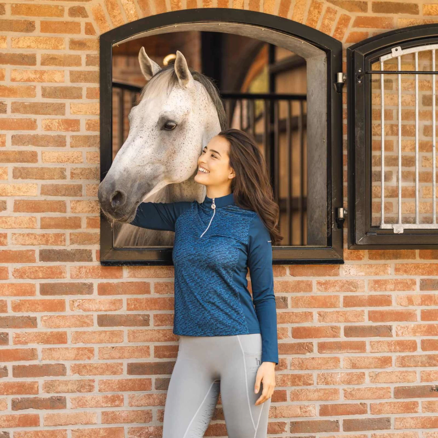 The Horze Livia Functional Shirt is a base layer with half zip and slight mock neck, perfect for training sessions on autumn days or as layering piece. The all-over print on the front panel in combination with the side seams creates a slimming form. A small branding on zipper puller and sleeve badge top off this timeless design.