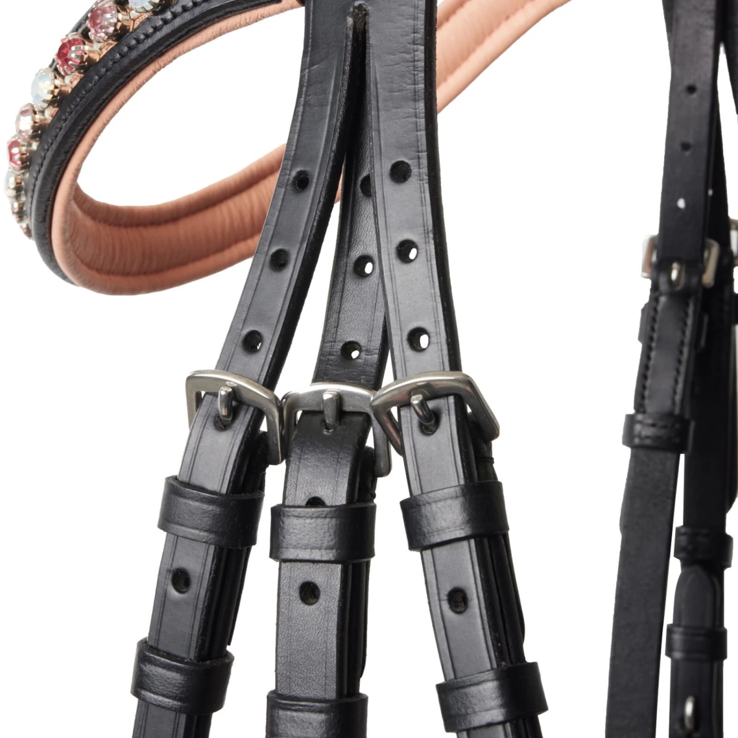 The Magic Carousel Bridle is a bright addition to your pony’s tack, thanks to it’s colorful soft padding at crown and browband. The combined noseband features a lining in the matching color. Colorful crystals in the browband make your pony stand out in teh arena. Don’t forget to get the matching Magical Carousel Rainbow Reins!