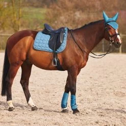 The Horze Marquess saddle pad is made with quick-dry lining that wicks away any moisture. The soft padding ensures a comfortable fit. The trim is decorated with sparkly cord and crystals, giving this dressage saddle pad a subtle bit of glitter. Pair with the Marquess Brushing boots (#19204) and Marquess ear net (#22924) for a full look.