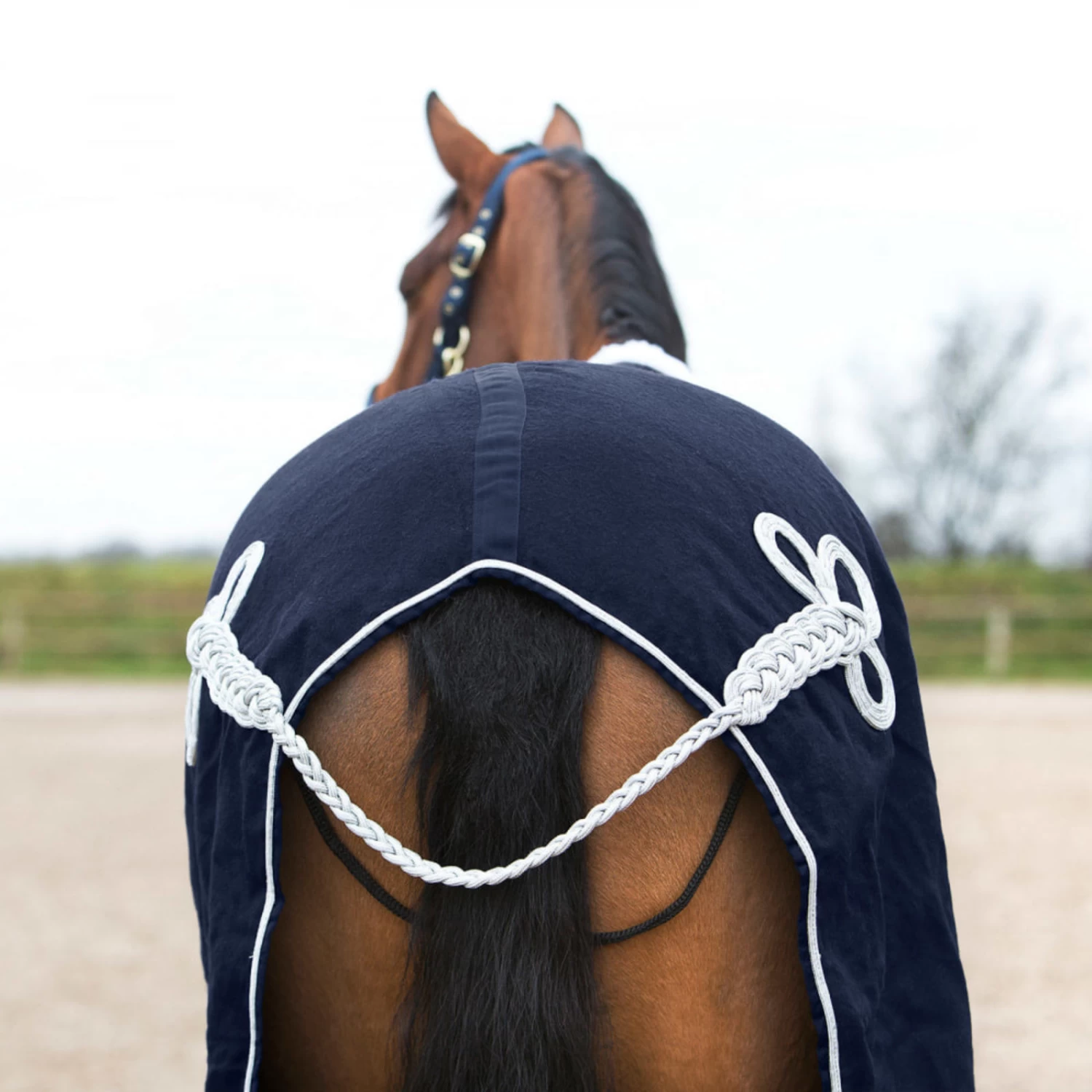This wool blanket is styled with a heavy corded embellishment on the hip in a classic design that compliments the lovely silver piping and Z logo. A secure fit with low cross surcingles and a double buckle front closure keep this sheet in place. The Millau dress sheet will be your favorite choice for travel as your horse will arrive refreshed and handsome with a clean and shiny coat as he unloads at your next event. Breathable wool means your horse stays warm yet won’t overheat. The durable construction looks delicate but is sturdy, robust, and washes well, lasting season after season.