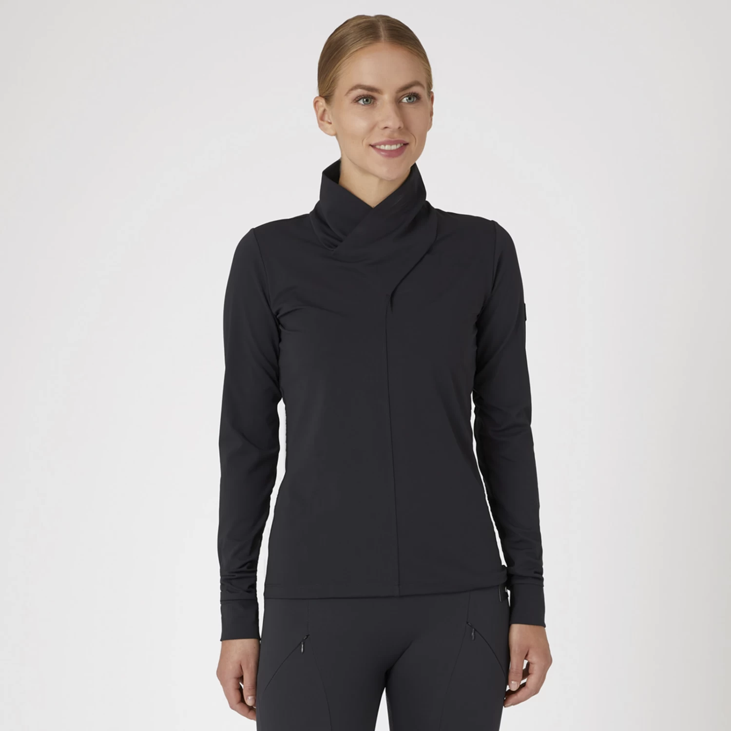 Our Raquel training shirt is made from super soft and breathable material. Comfortable stretch gives you the freedom of movement that you need while riding. It is perfect for wearing with a padded vest in autumn or under a jacket in winter. The crossed neck is a refined detail that will set you apart from everyone else, and it also keeps you warm in chilly weather.