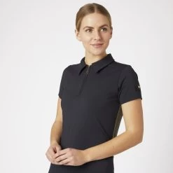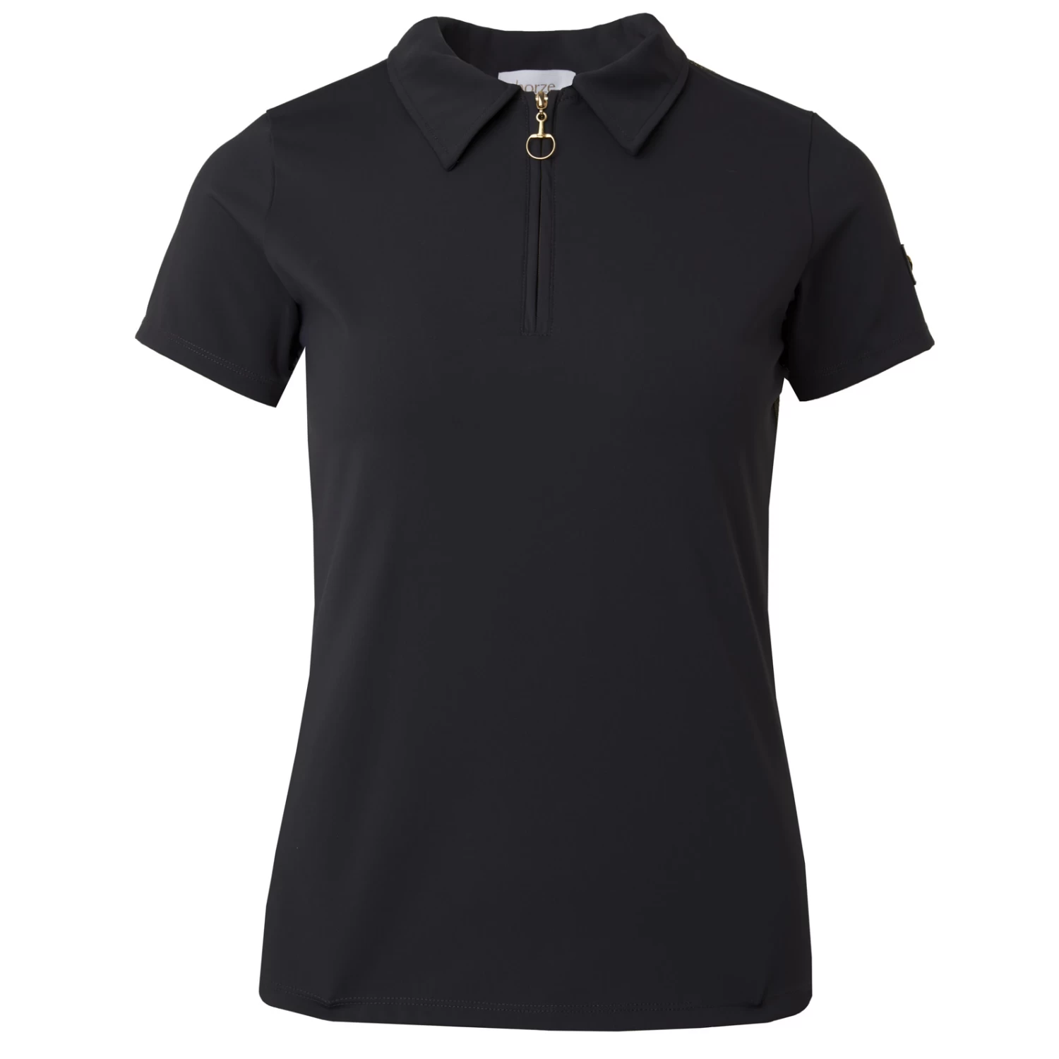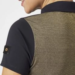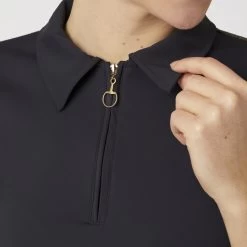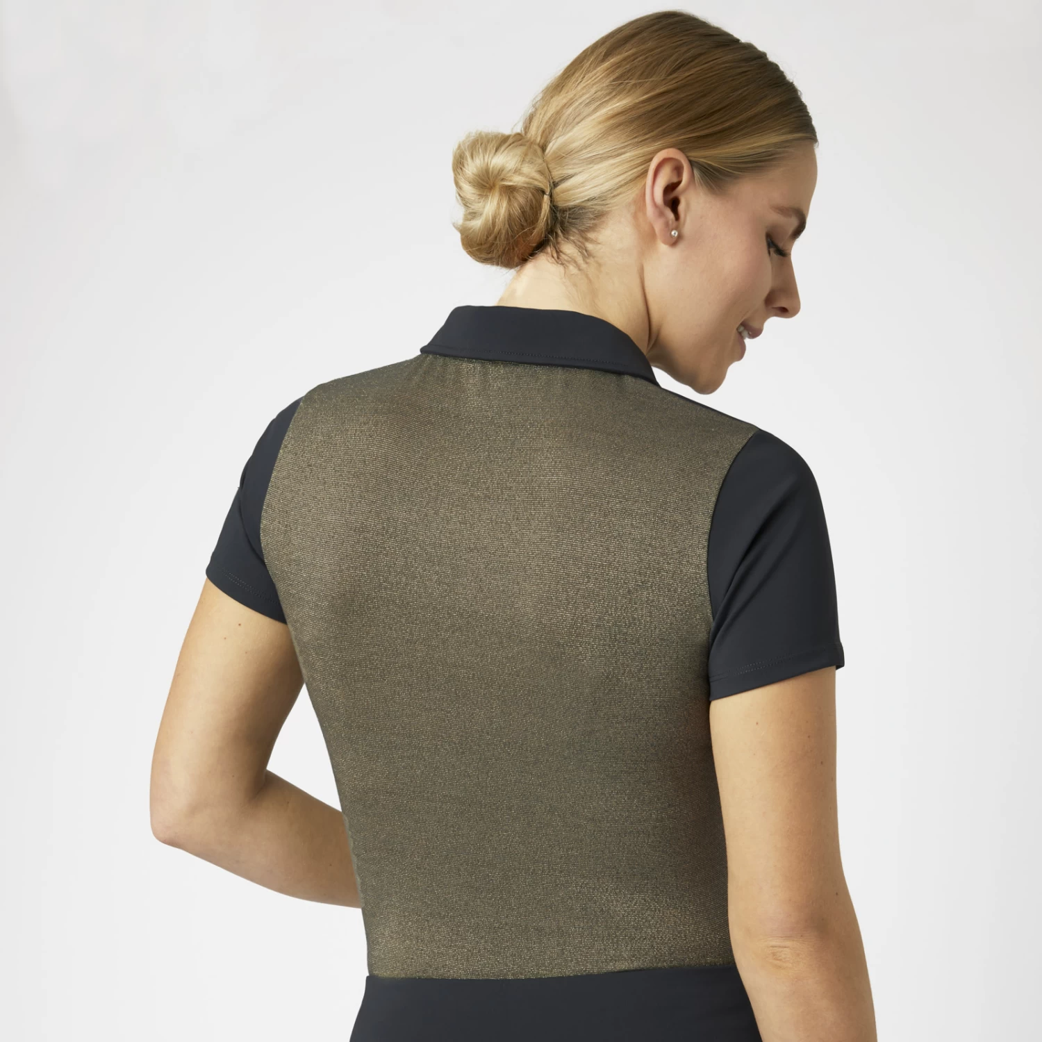 Our breathable, quick-drying Horze Sagira training shirt is designed in a classic fit. The back is completely made from golden glitter fabric that adds a stunning detail. Lightweight material is great for training. The gold zipper opening provides extra ventilation. Pair this shirt with our Horze Sagira riding tights for a complete outfit.