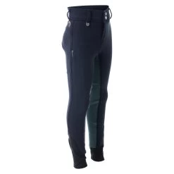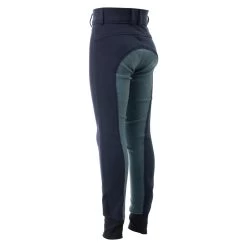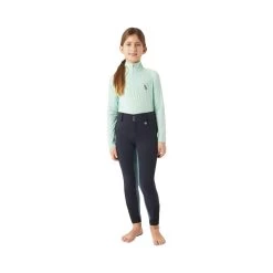 The perfect breeches for young girls who like to dress colorfully. The silicone full grip in pastel rainbow colors has the shape of raindrops and small ‘h’ logos. Below the back waistband a delicate rainbow embroidery is placed. Elastic leg cuffs for increased wearing comfort and less bulk beneath the boots. The breeches can be worn with a belt of your choice thanks to the belt loops. A zip pocket on the right thigh has enough room for your phone.