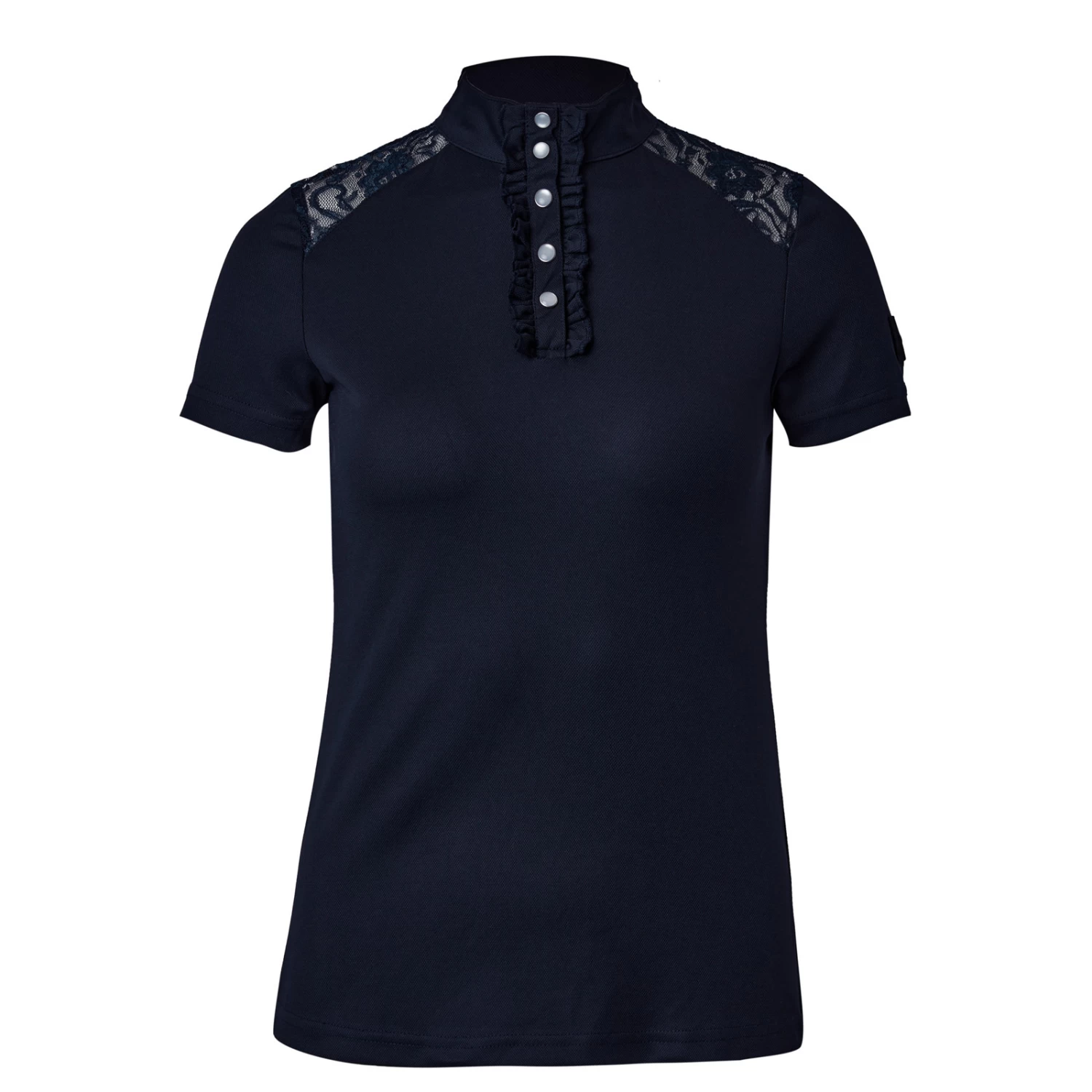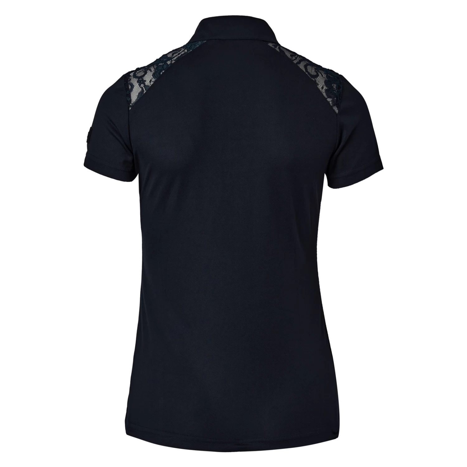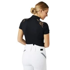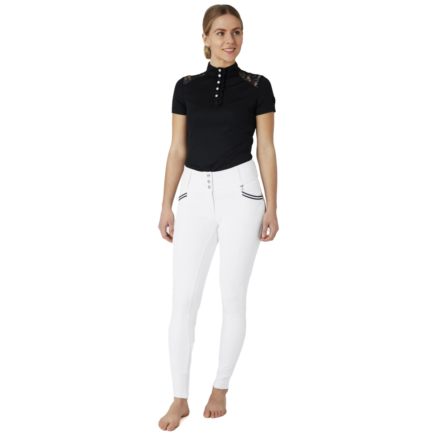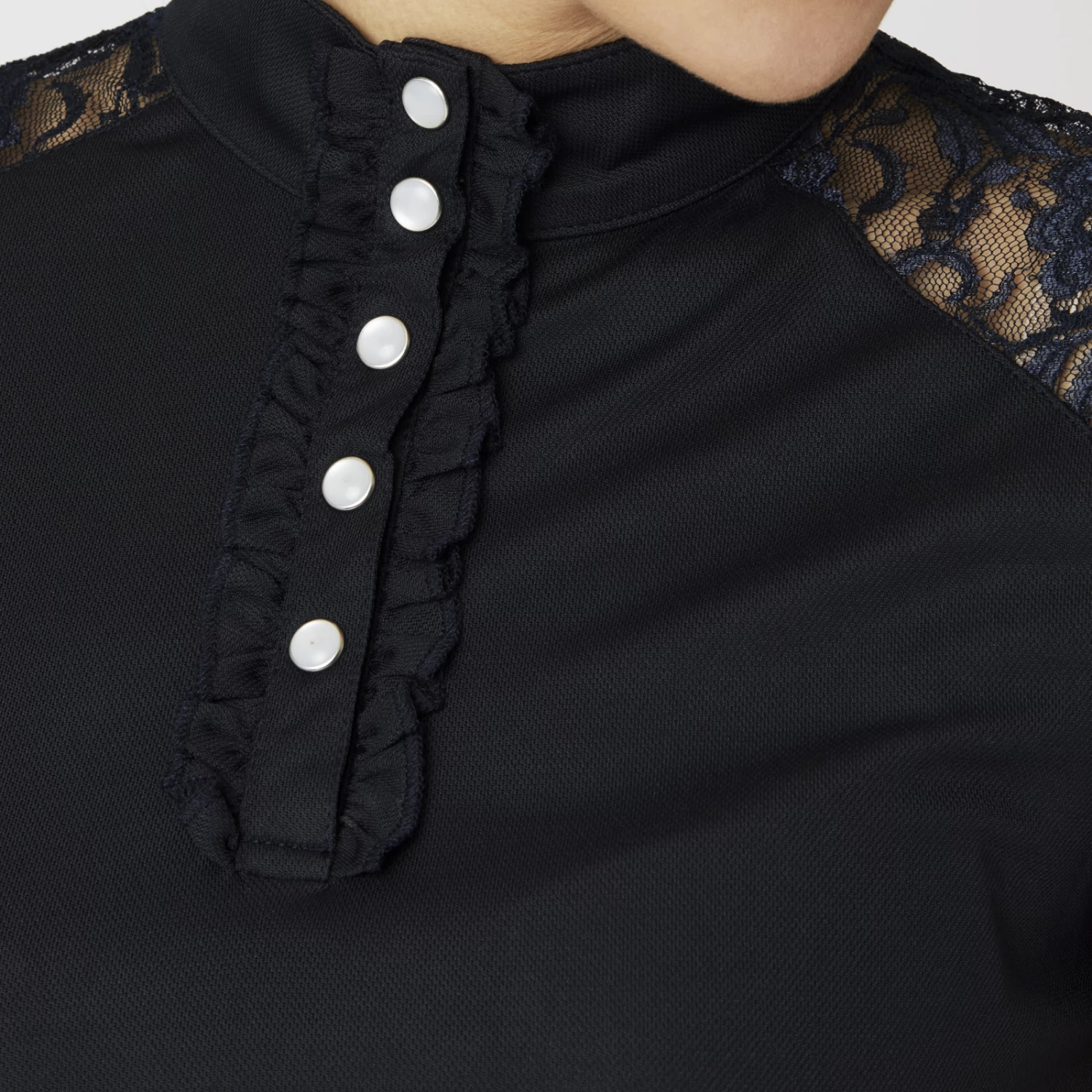 The Horze Sianna show shirt is made from breathable material that will keep you cool. Delicate lace at the shoulders looks elegant, and the buttons at the placket are extra chic. Timeless colors match your show wardrobe, and can easily be paired with your favorite show breeches and jacket.