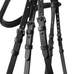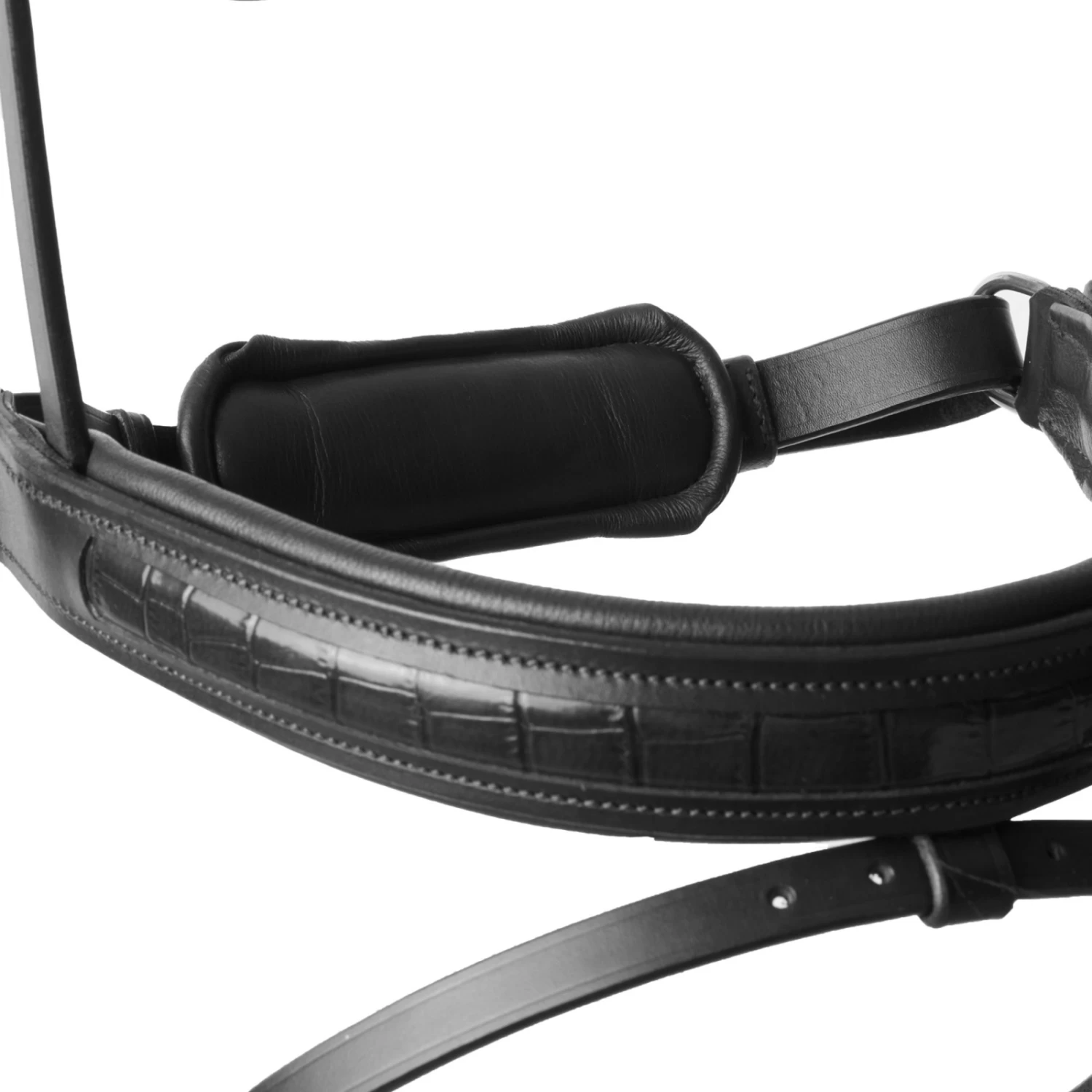 The bridle is equipped with a padded anatomic headpiece and crank noseband, meticulously designed to provide maximum comfort and alleviate pressure on sensitive areas of the horse’s head. This feature ensures a pleasant and ergonomic fit for your equine companion. The flash strap can be removed if you prefer to ride without it. To customize your horse’s look, the browband can be easily removed and exchanged. With its patent croco details in brow- and noseband, this bridle is an eye-catcher at shows and training sessions.