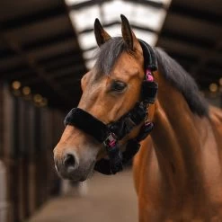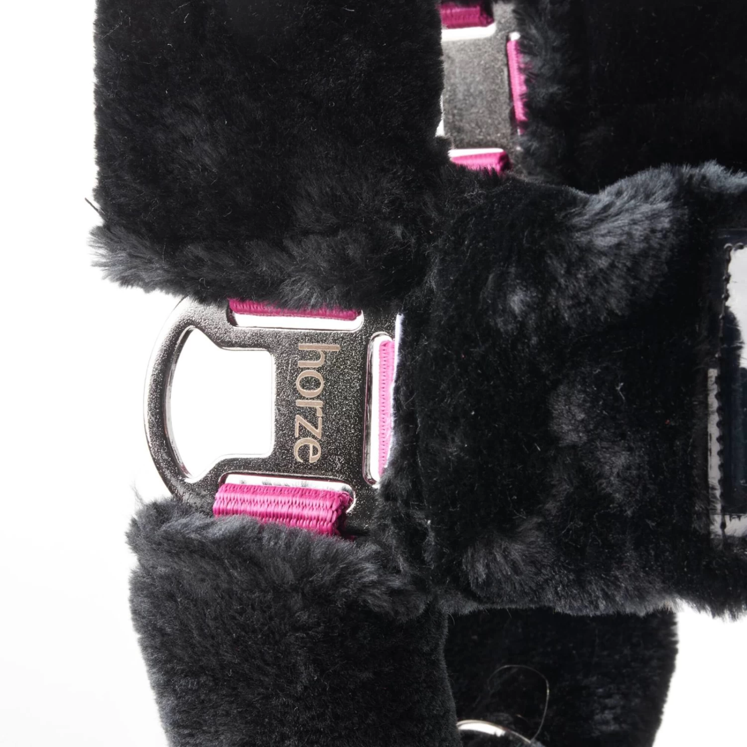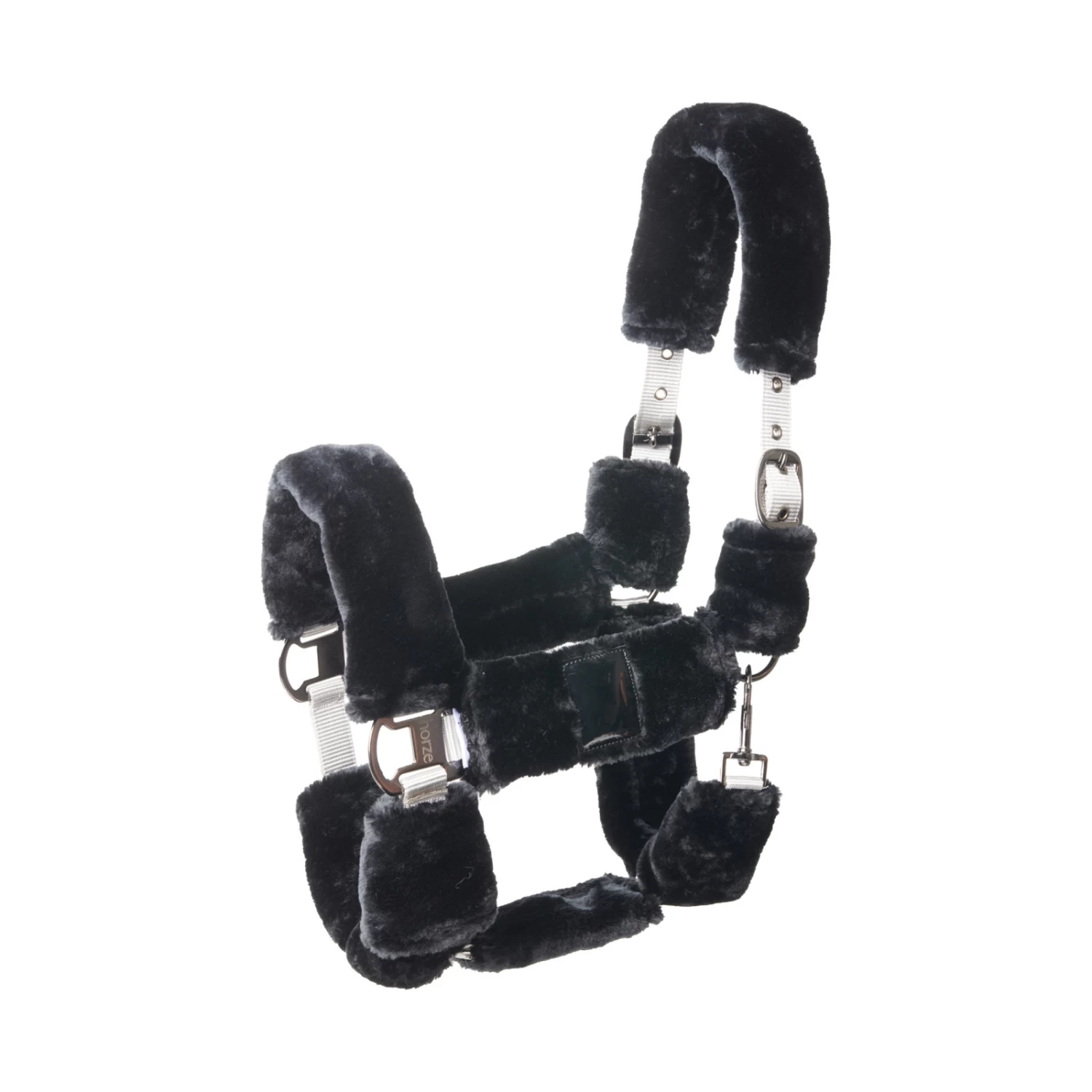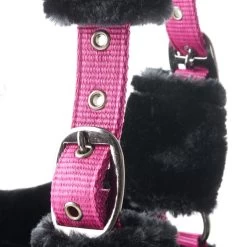 Strong webbing covered with soft fluffy faux fur creates a durable halter that avoids chafing. Gunmetal fittings create an elegant look. Matching lead with panic hook (#22696) or snap (#22697) available.
