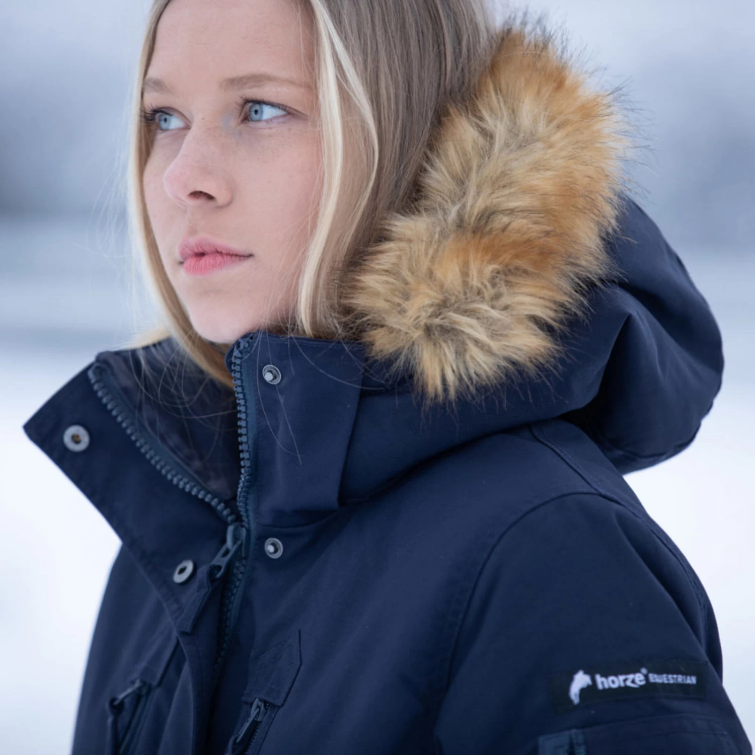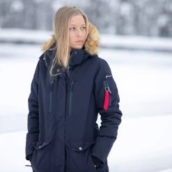 Choose this sporty, long women’s parka for plenty of warmth with function and durability. The jacket is warm, water repellent and windproof for any type of winter weather. The 2-way zipper and zipper side openings are just a few of the many details. Plenty of pockets and a hood with stunning fur trim make this a remarkable coat. The longer cuffs make it easy to pull them over your hands while you ride for added warmth. Full-dull, PU coating 3000/3000mm/mvp.